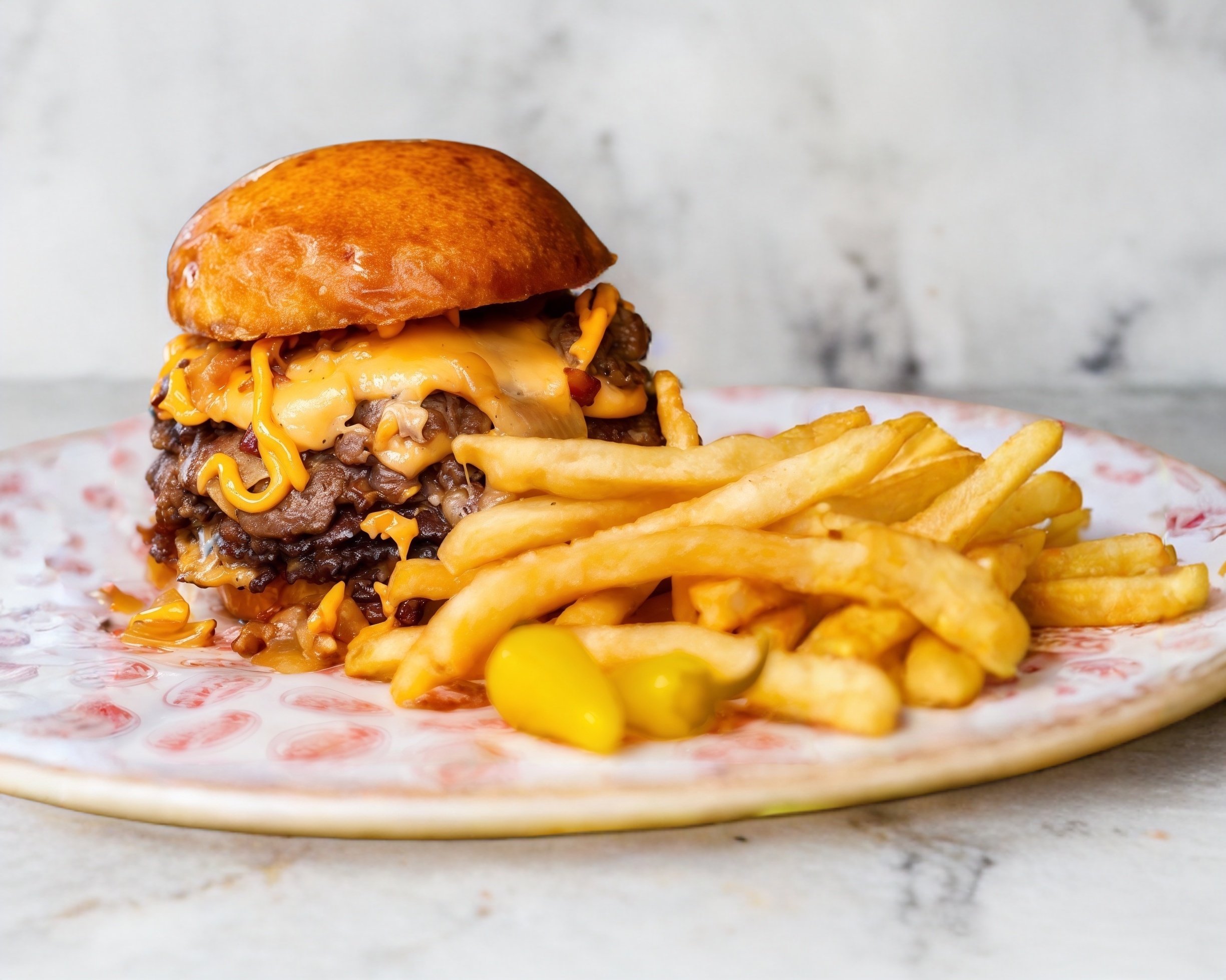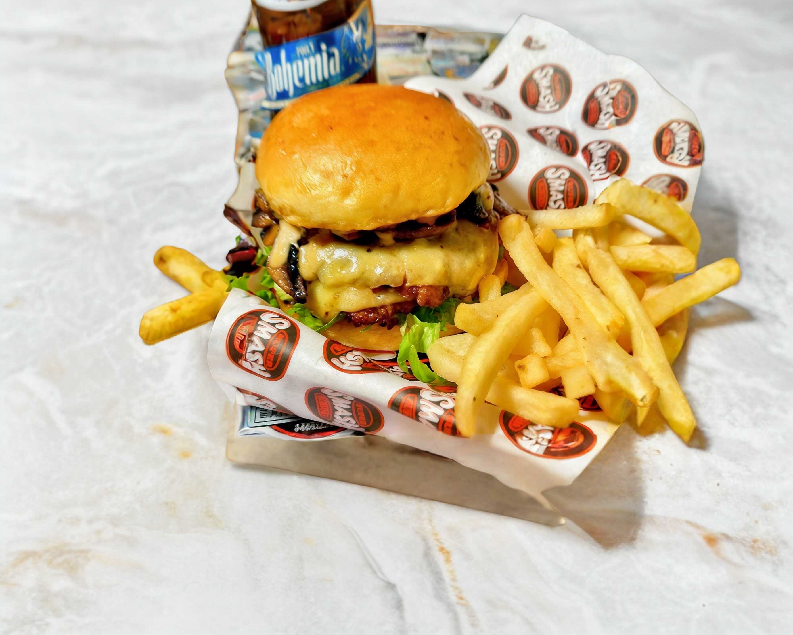 Pan Brioche, 2 carnes 100% Angus certificada, queso americano, mermelada de tocino, aderezo smash. Lechuga, tomate, cebolla (opcional). Incluye papas a la francesa.
