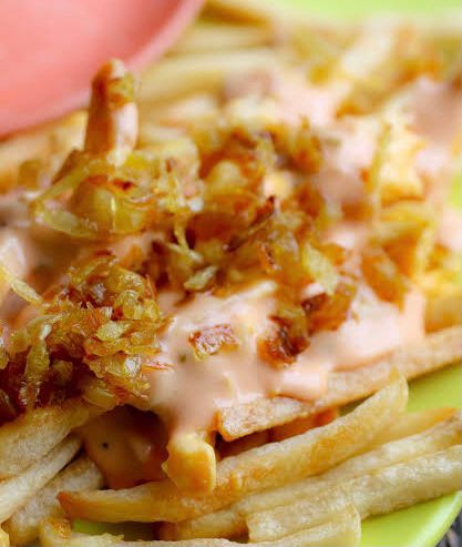 Papas a la francesa, carne smash, aderezo smash , queso americano, mermelada de tocino, chicharron de serrano