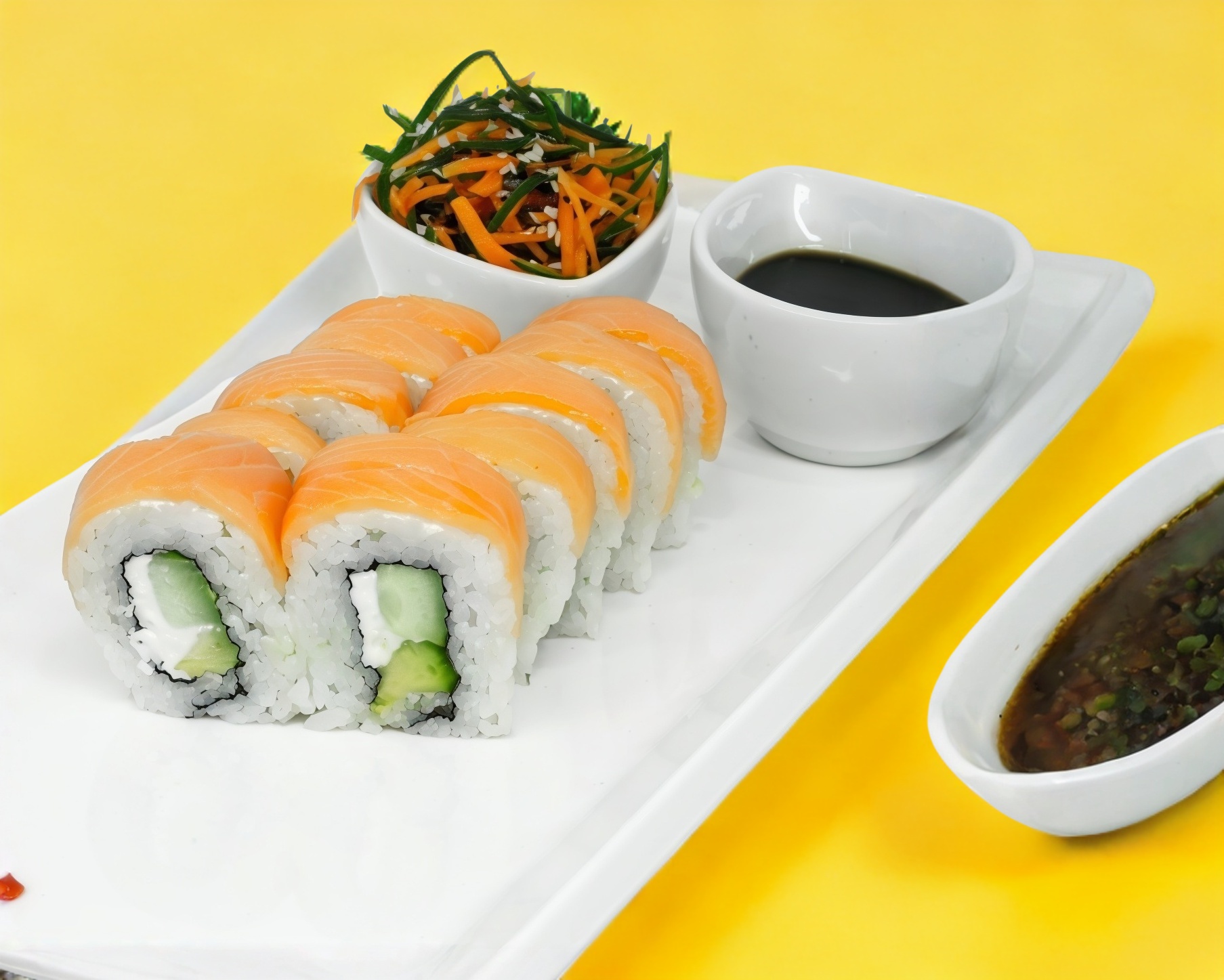 Aguacate, pepino y philadelphia por dentro, cubierto de salmón fresco. acompañado de aderezo jalapeño y salsa ponzu. (10 pzas).