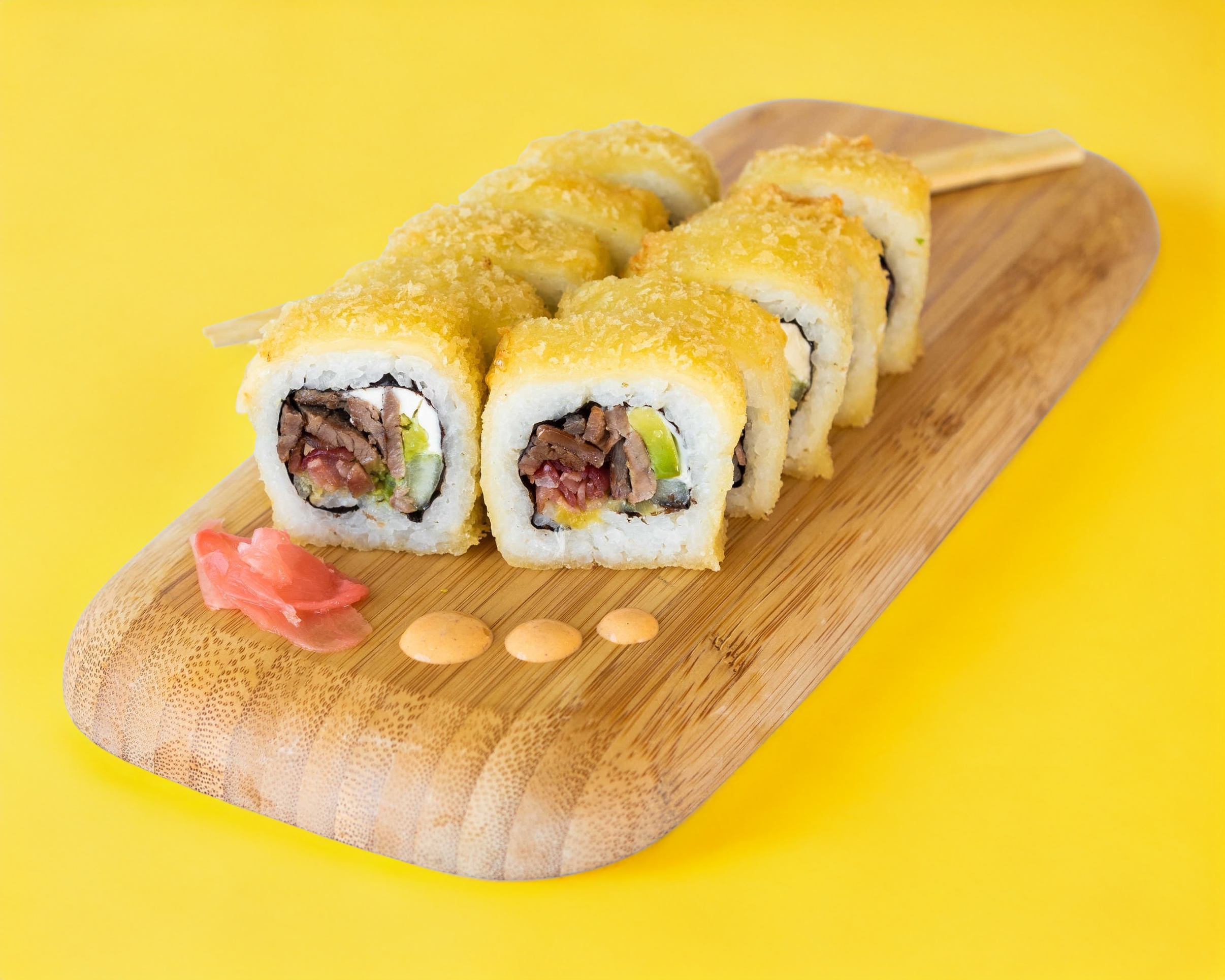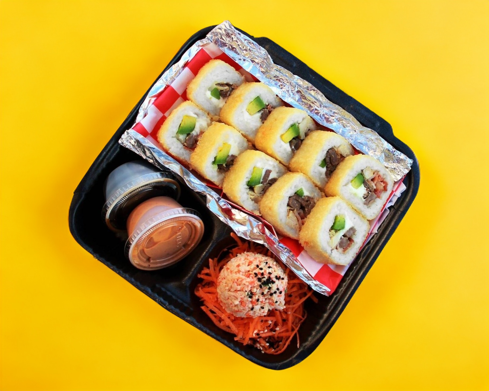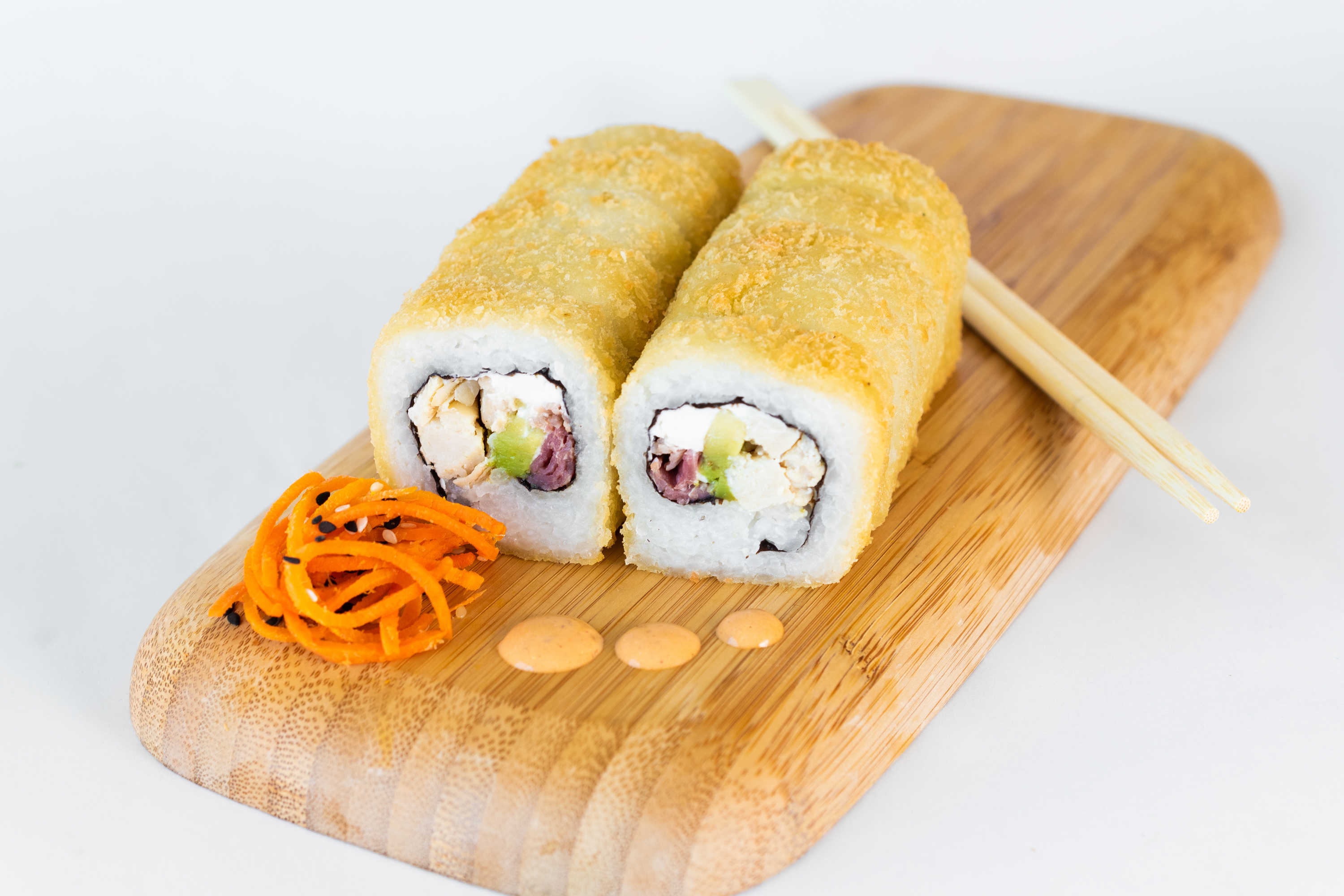 Sushi empanizado, por dentro lleva Philadelphia, aguacate, pollo, res y tocino. Acompañado de zanahoria, tampico, salsa ponzu y nuestro delicioso aderezo chipotle.