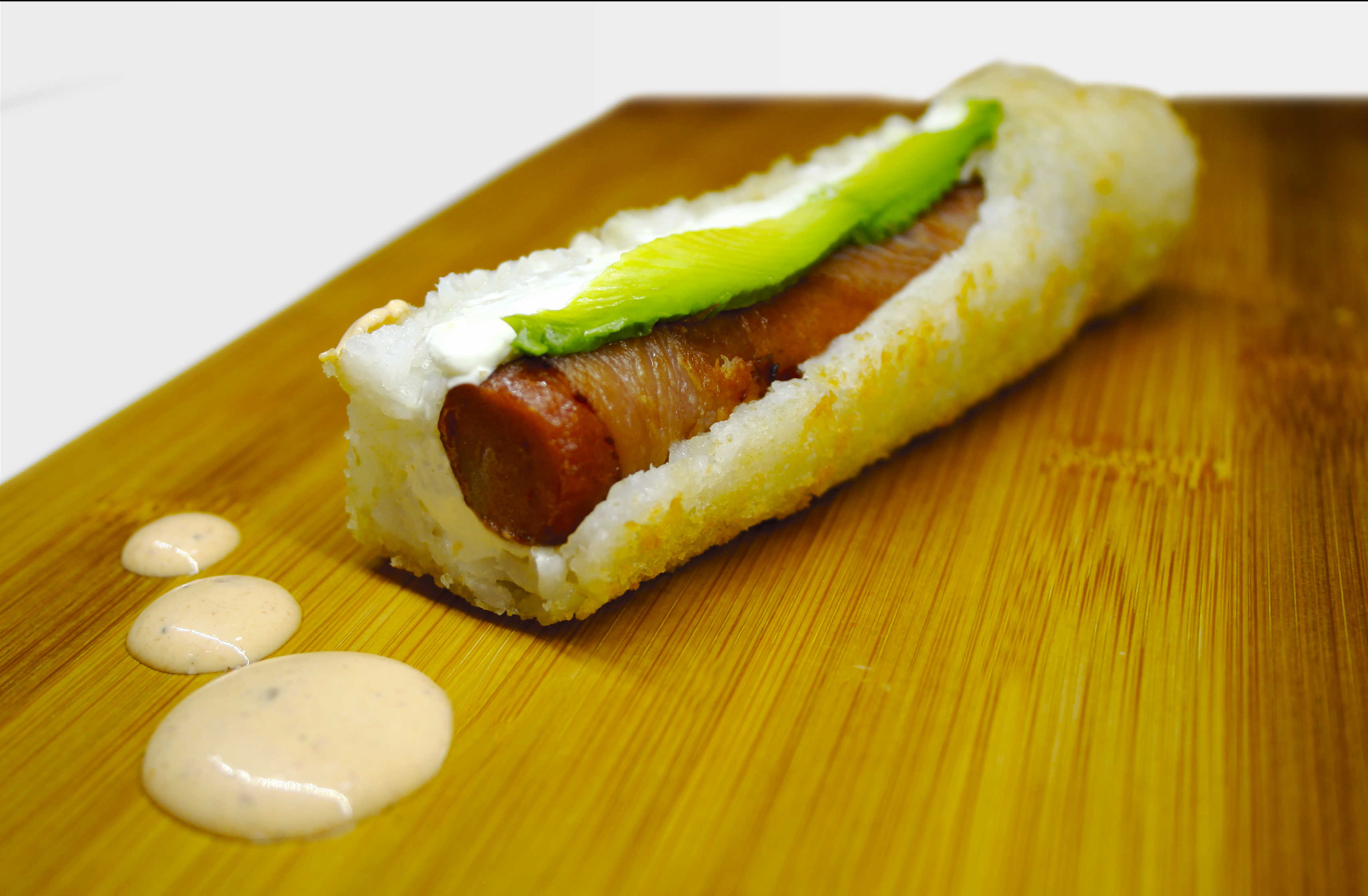 Por dentro salchicha envuelta con tocino, philadelphia y aguacate, todo dentro de una banderilla de arroz empanizada. Acompañado de aderezo chipotle.