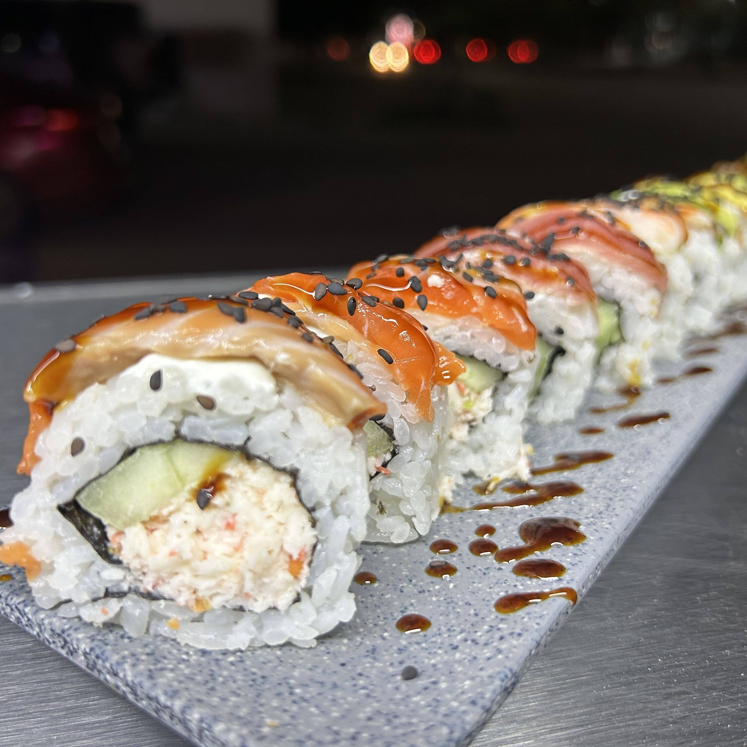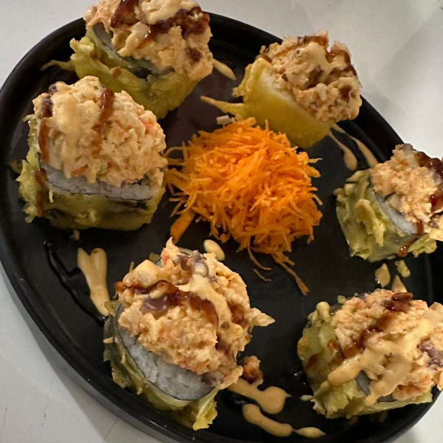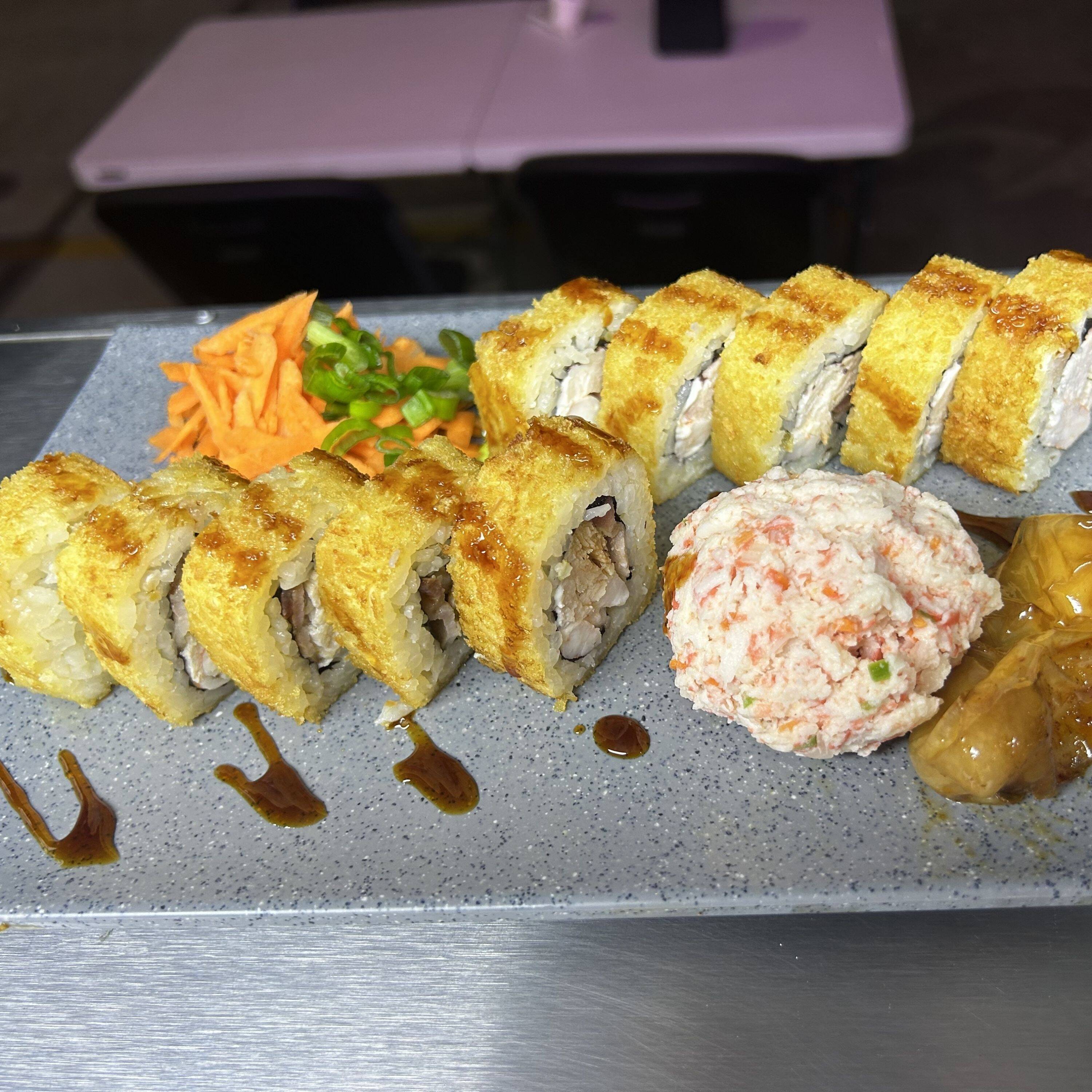 Por dentro camaron tempura y tampico por fuera laminado de salmon (flameado)