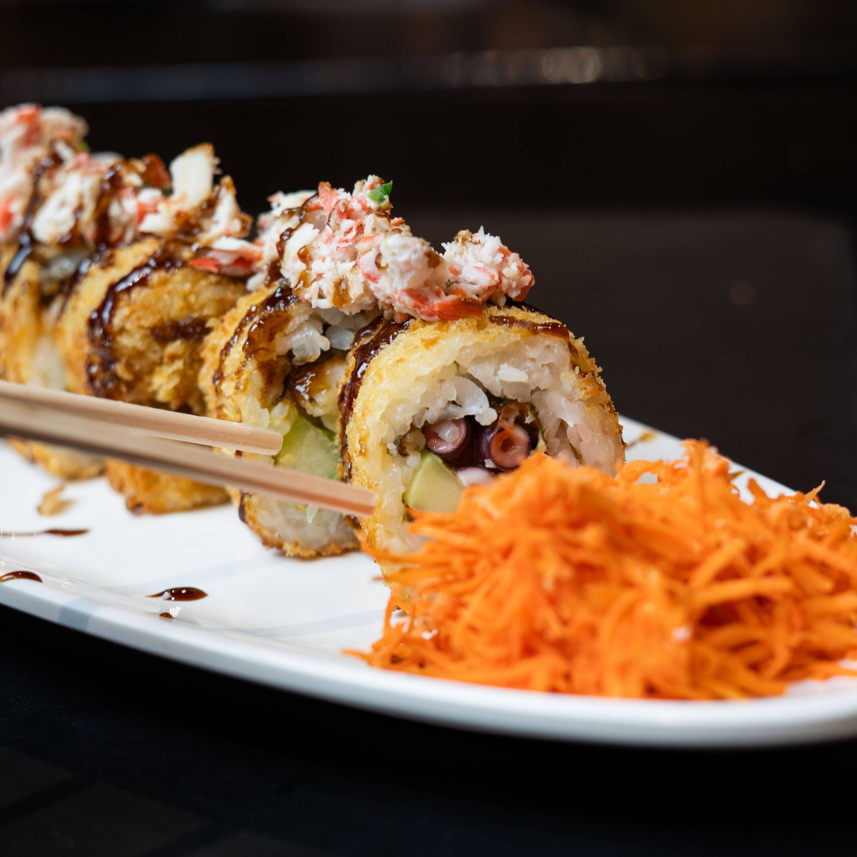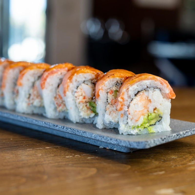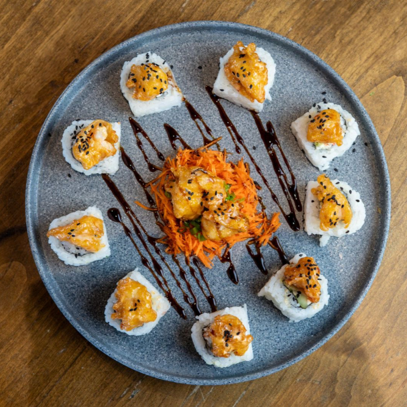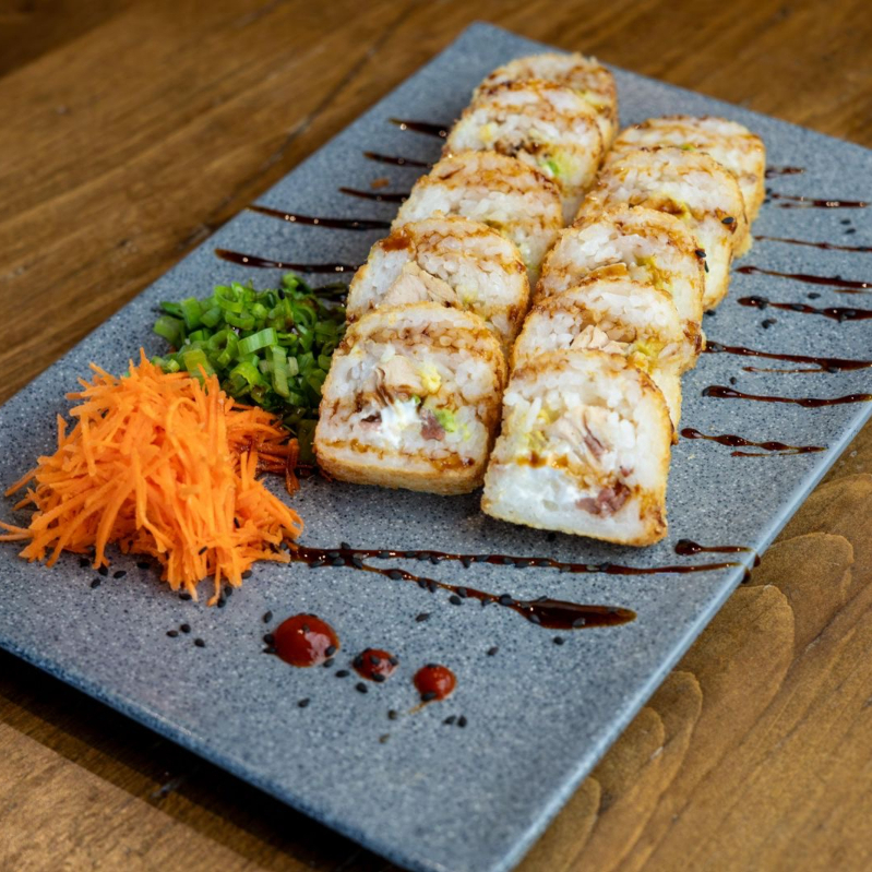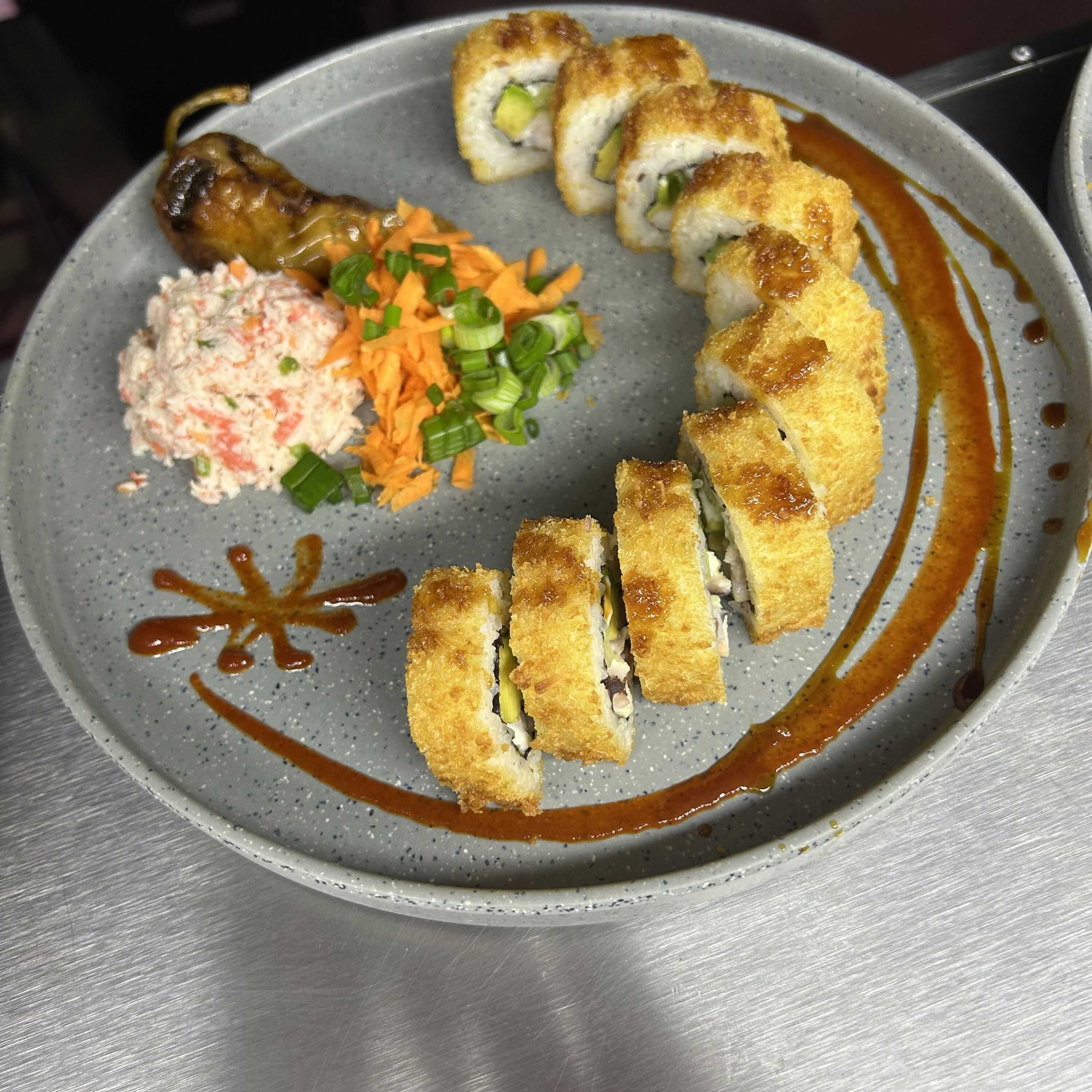 Por dentro camaron tempura y tampico por fuera laminado de salmon (flameado)