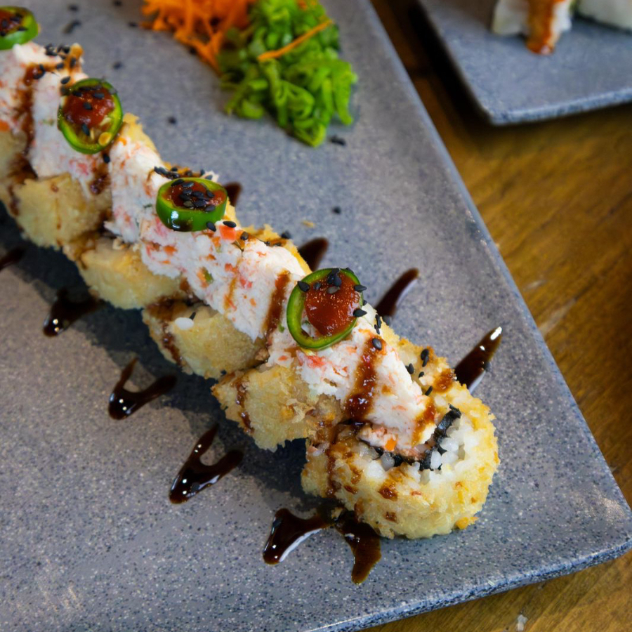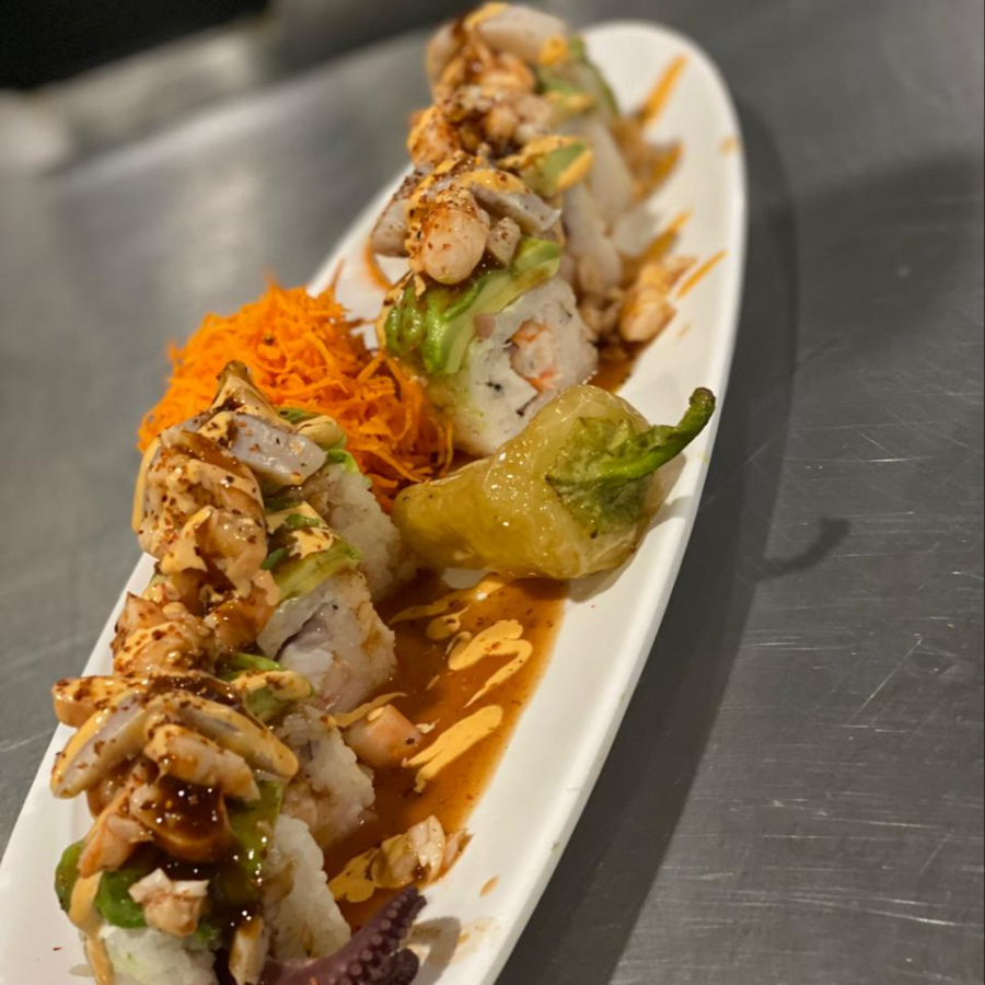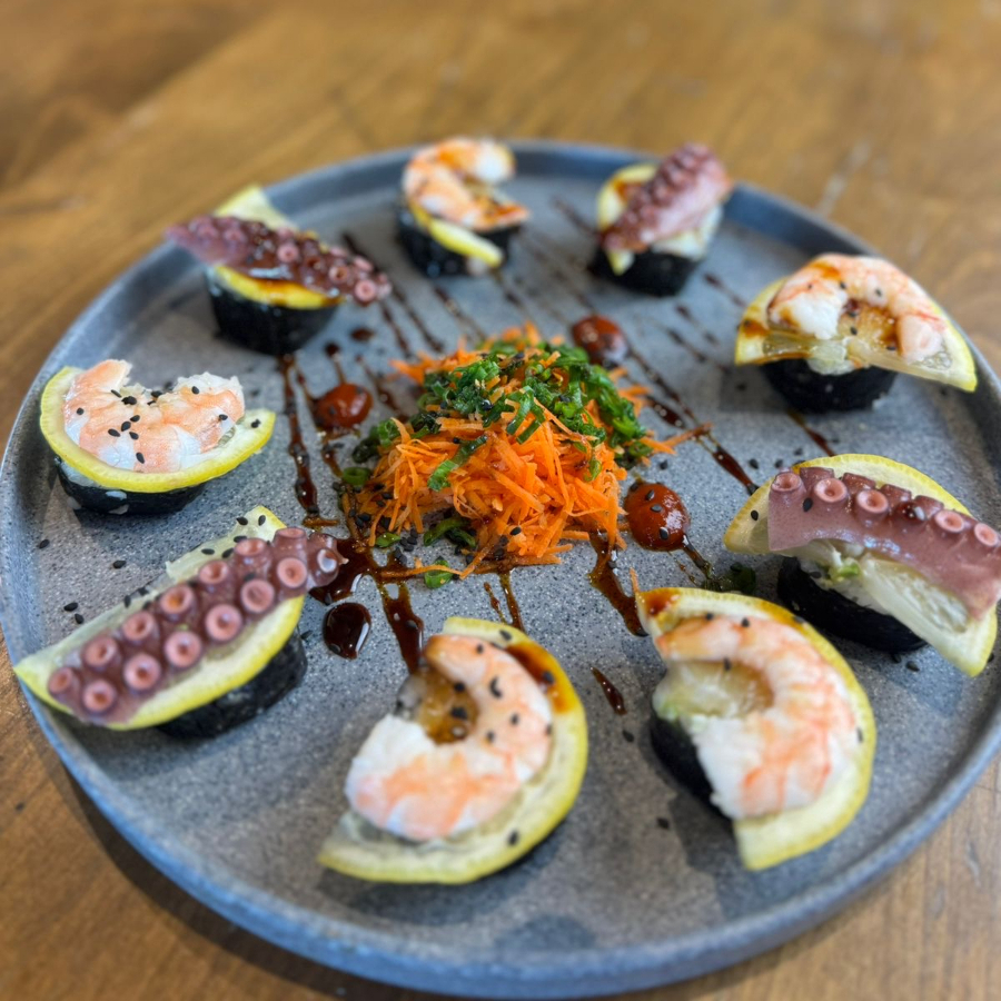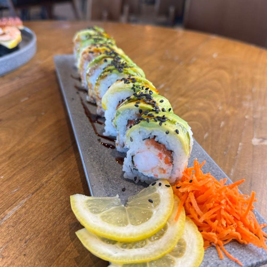 Camaron cosido, salmon, atun y tampico por fuera limon real y aguacate