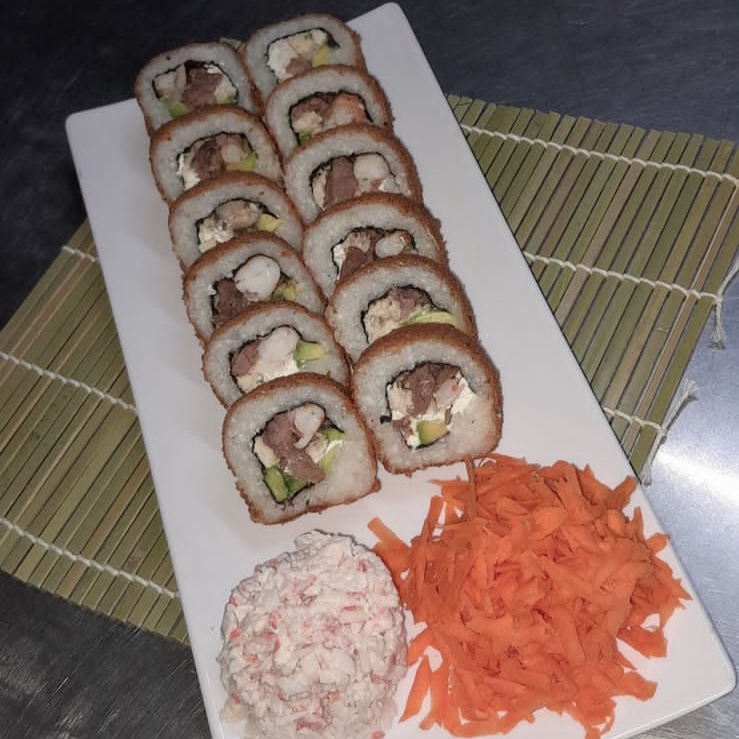 Res, pollo, tocino, aguacate y philadelphia, acompañado de tampico, zanahoria, cebollín, aderezo chipotle y salsa china.
