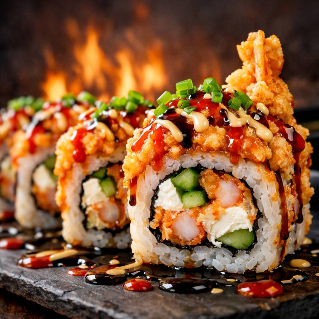 Sushi con Queso Crema, Aguacate, Camarón Capeado, Res Empanizada, Cebollín y Chile toreado