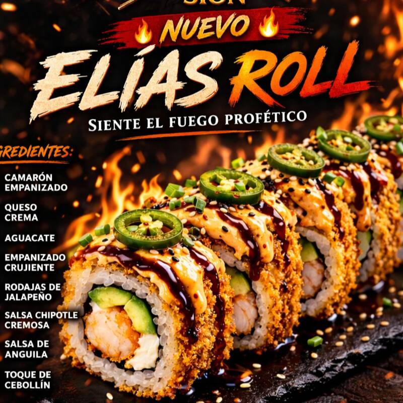 Por dentro:Camarón empanizado, Queso crema Aguacate. Arriba: Rodajas de jalapeña, Aderezo chipotle, Salsa de anguila y un Toque de cebollín