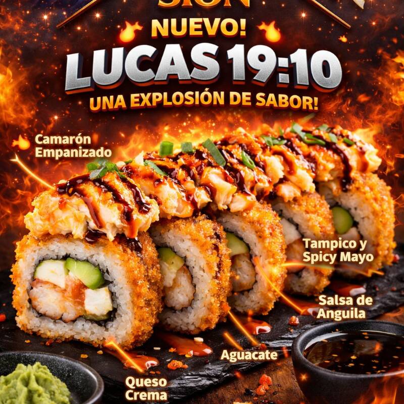 Por dentro: Camarón empanizado, Queso crema Aguacate. Por fuera: Tampico, Salsa spicy con un toque de salsa de anguila