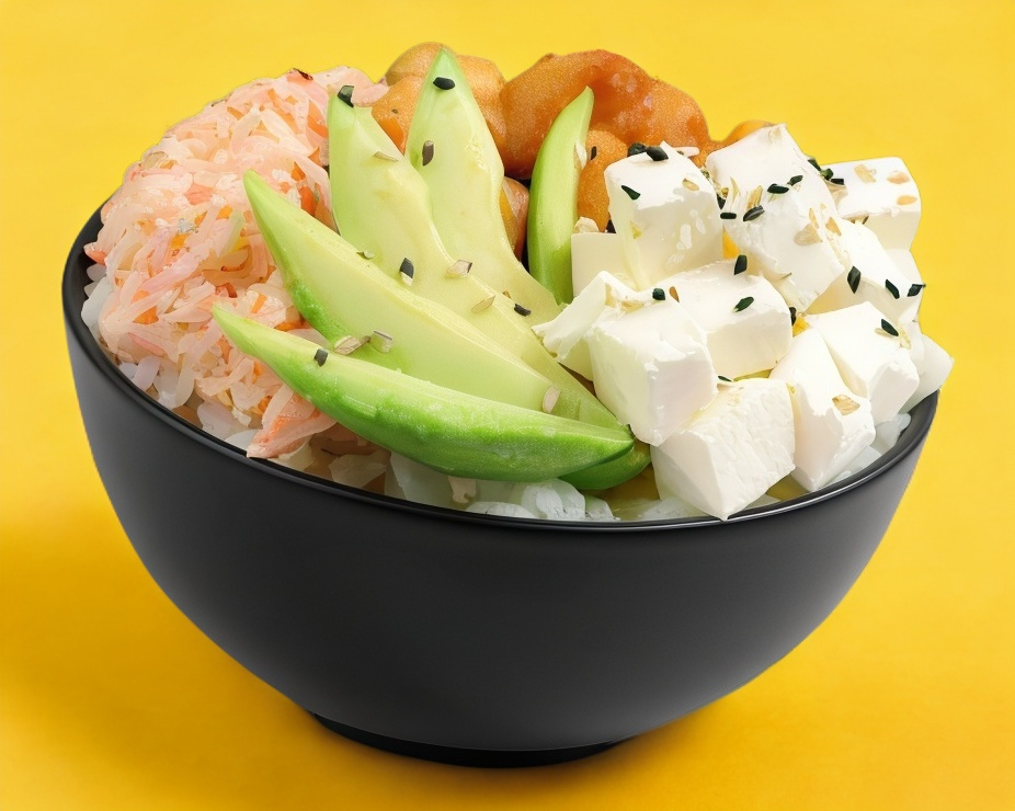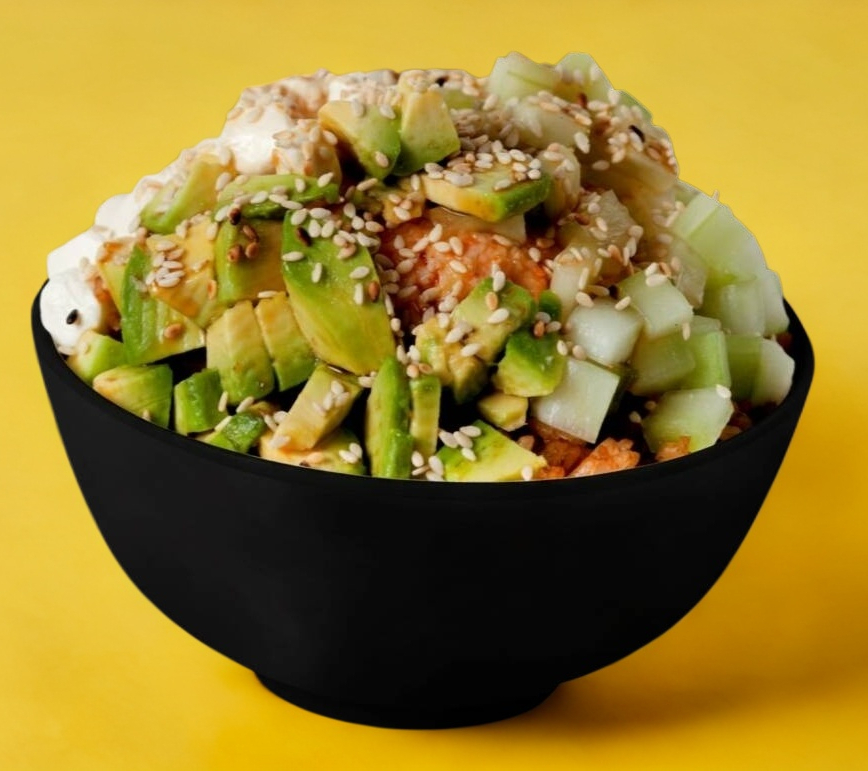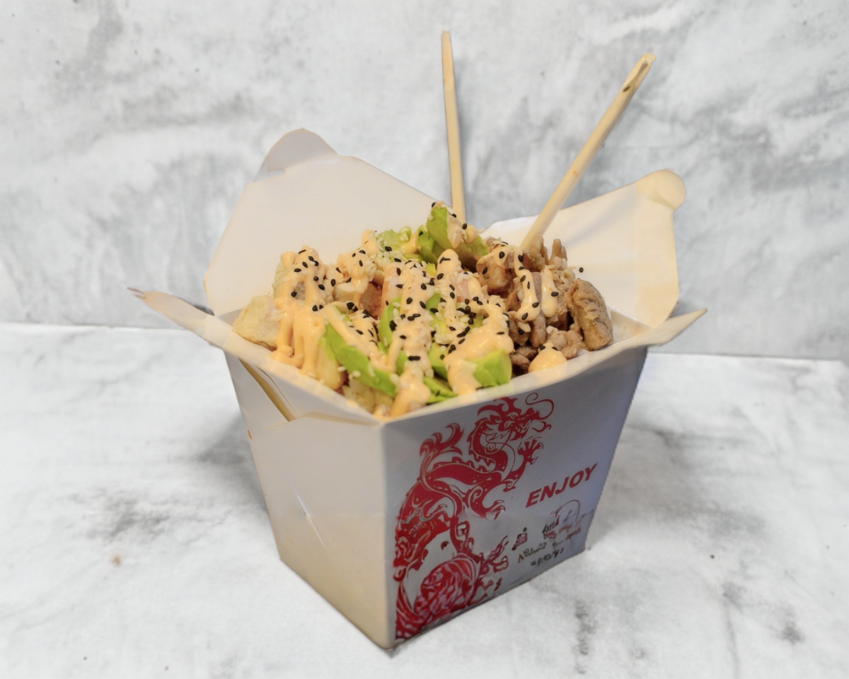 Arroz frito acompañado de ensalada de Tampico, Philadelphia, camarón, res, pollo, aguacate, bañado con salsa spicy y ajonjoli.