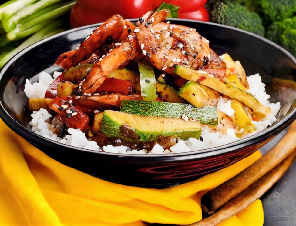 Cama de arroz blanco, acompaño de camarones en salsa cantonez y verduras mixtas (calabaza, piminetos verde y rojo), espolvoreado con ajonjoli