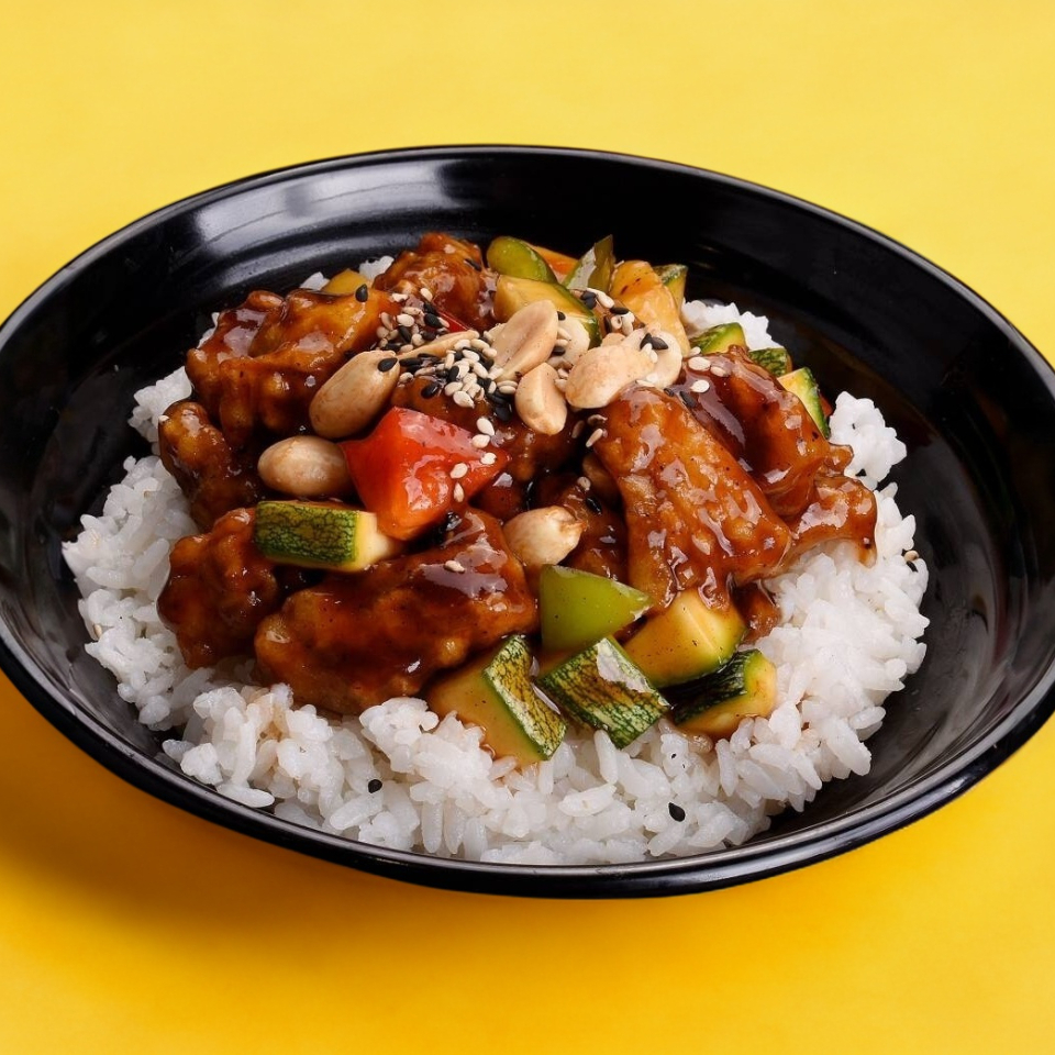 Cama de arroz blanco, acompañado de pollo capeado, bañado en salsa picosita, verduras mixtas, calabazas pimiento rojo y verde espolvoreados con cacahuate y ajonjolí