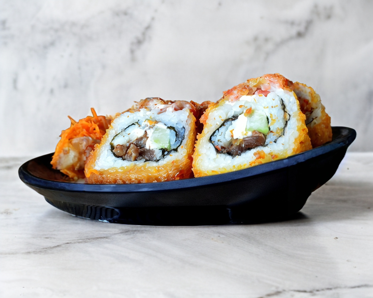 Rollo empanizado, relleno con queso philadelphia, pepino, alga, fajitas de pollo, decorado con jugosa res, apetitoso tocino, bañado con salsa spicy.