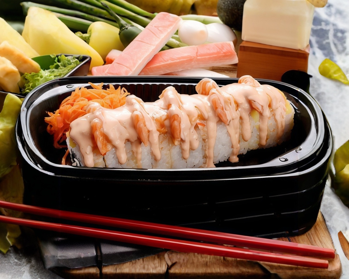 Arroz de sushi con ensalada tampico, pollo capeado, queso philadelphia y aguacate, bañado con salsa teriyaki y espolvoreado con ajonjolí.