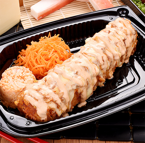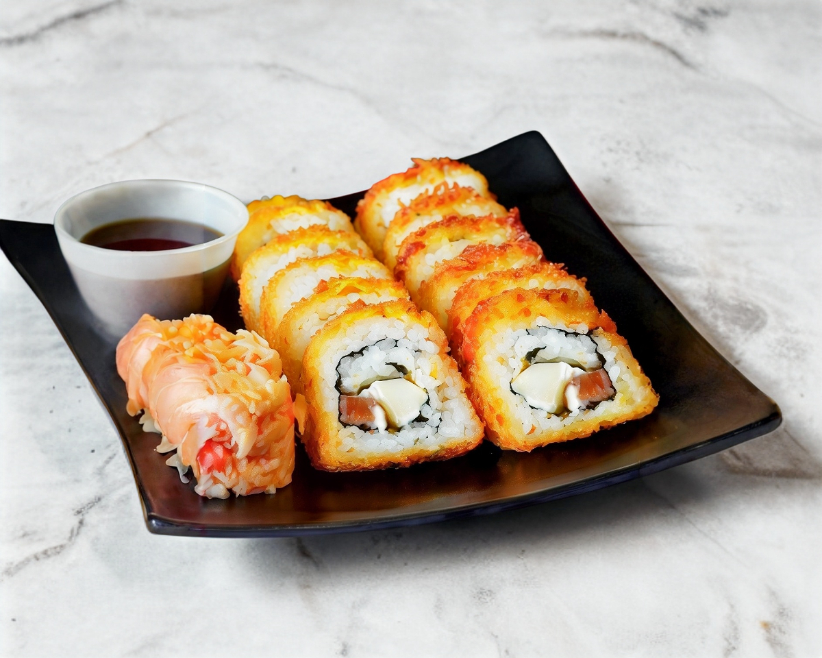 Rollo empanizado, relleno con queso philadelphia, pepino, alga y delicioso camarón y jugosa res, acompañado de ensalada de surimi.