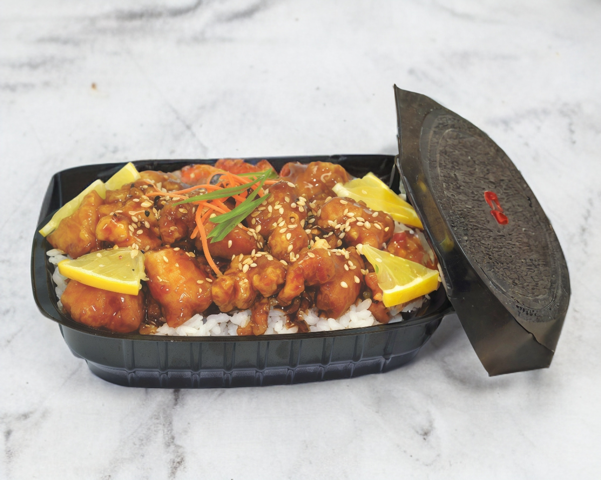 Arroz, acompañado de 2 guisos ( pollo a la narnaja y puerco taiwan en salsa monfol) 2 rollos de primavera, 1 sushi bombaso (surimi, philadelphia, pepino) y 2 lt de te