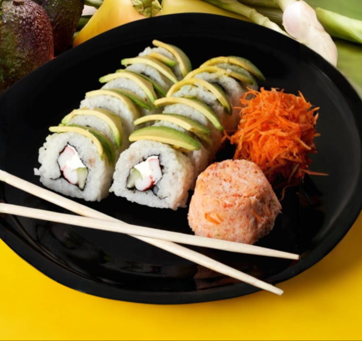 Rollo natural, relleno con pepino, alga surimi y queso philadelphia, decorado con delicisos aguacate, acompañado de ensalada de surimi.