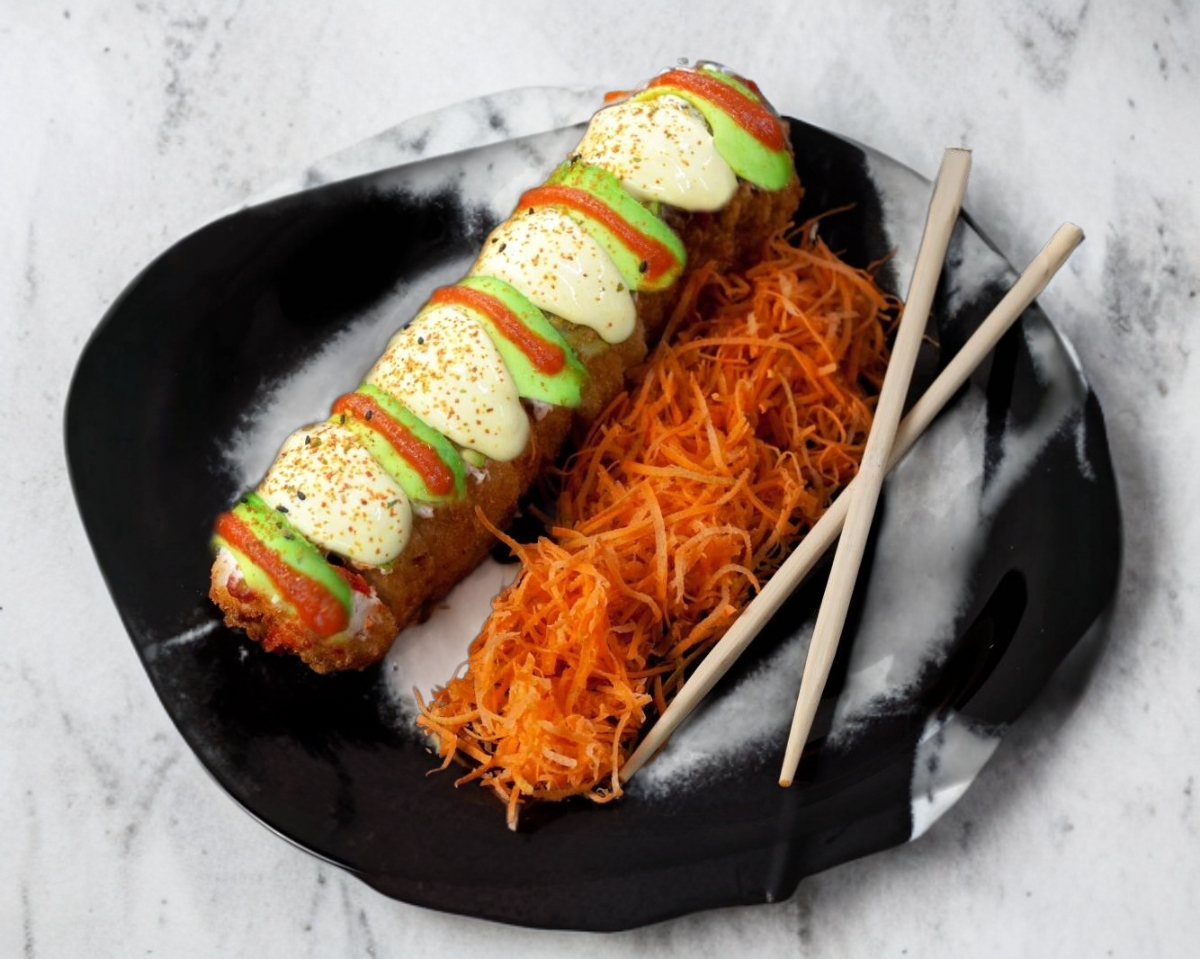 Rollo empanizado, relleno con camarón, pepino, alga y queso philadelphia, cubierto con aguacate, salsa spicy y togarashi.