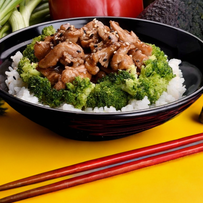 Cama de arroz blanco, acompañado de pechuga a la planchada bañada en salsa teriyaki, verduras albapor, salpeadas en mantequilla,ensaldas de pepinos dulces y medio sushi california. (natural)