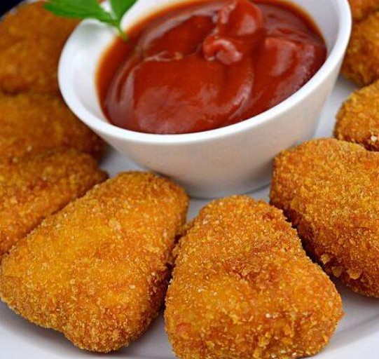 8 pzs De nuggets de pollo empanizado, acompañados de aderezo.