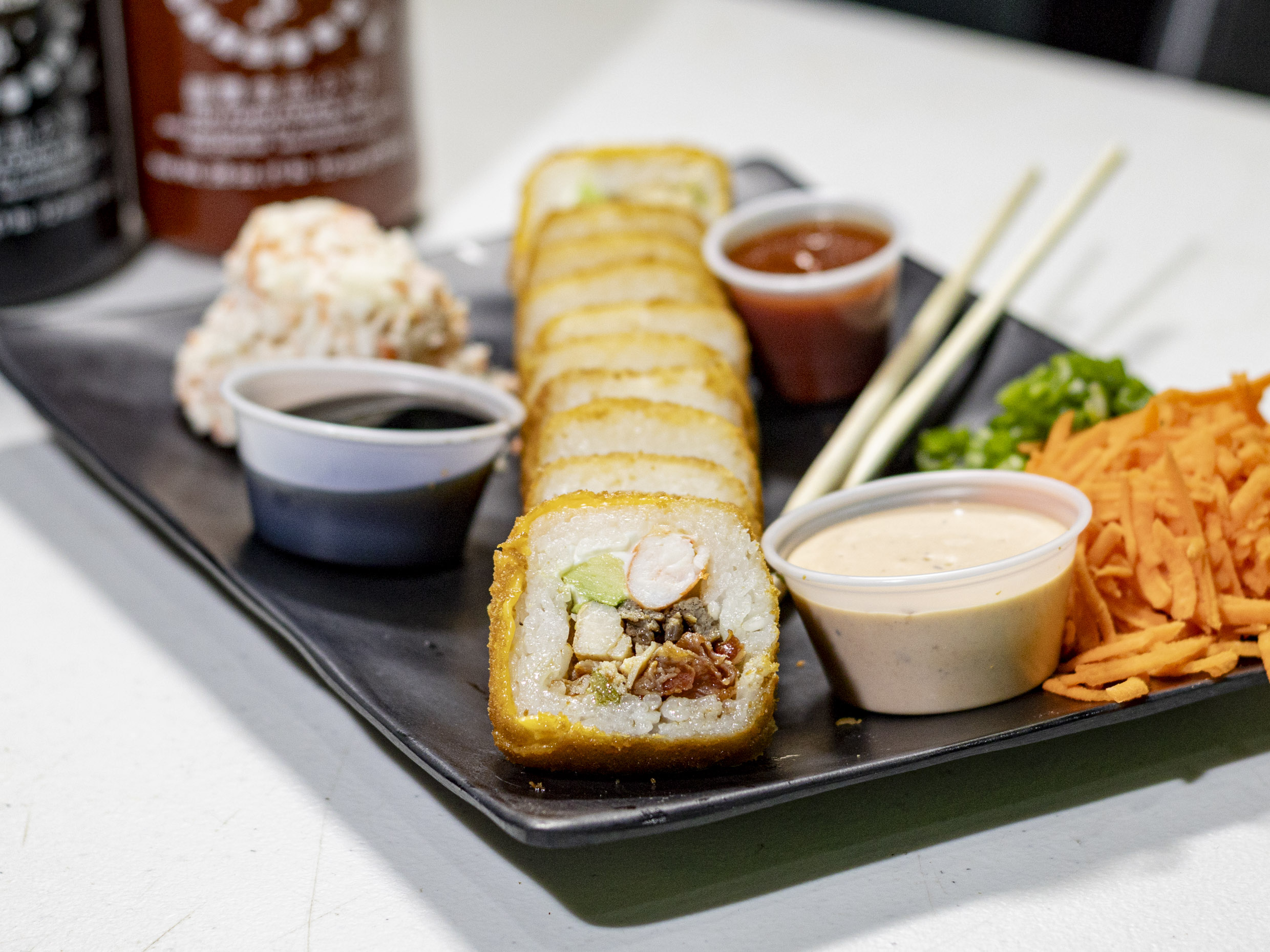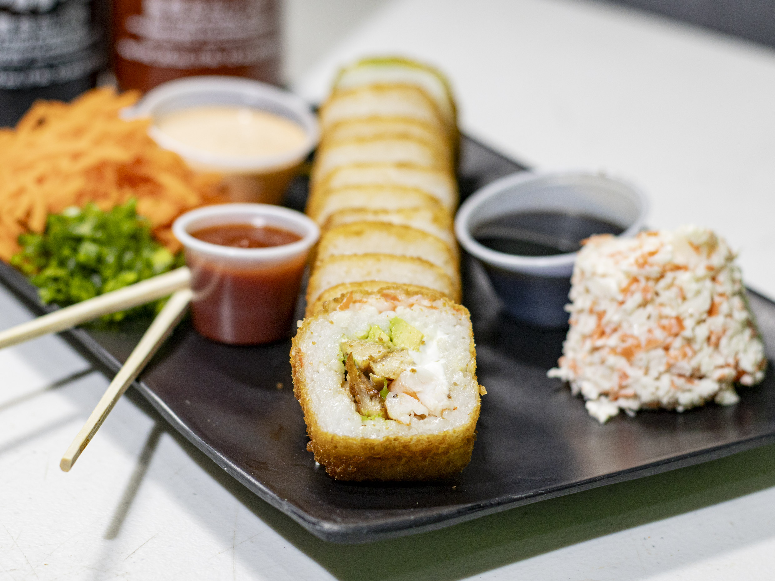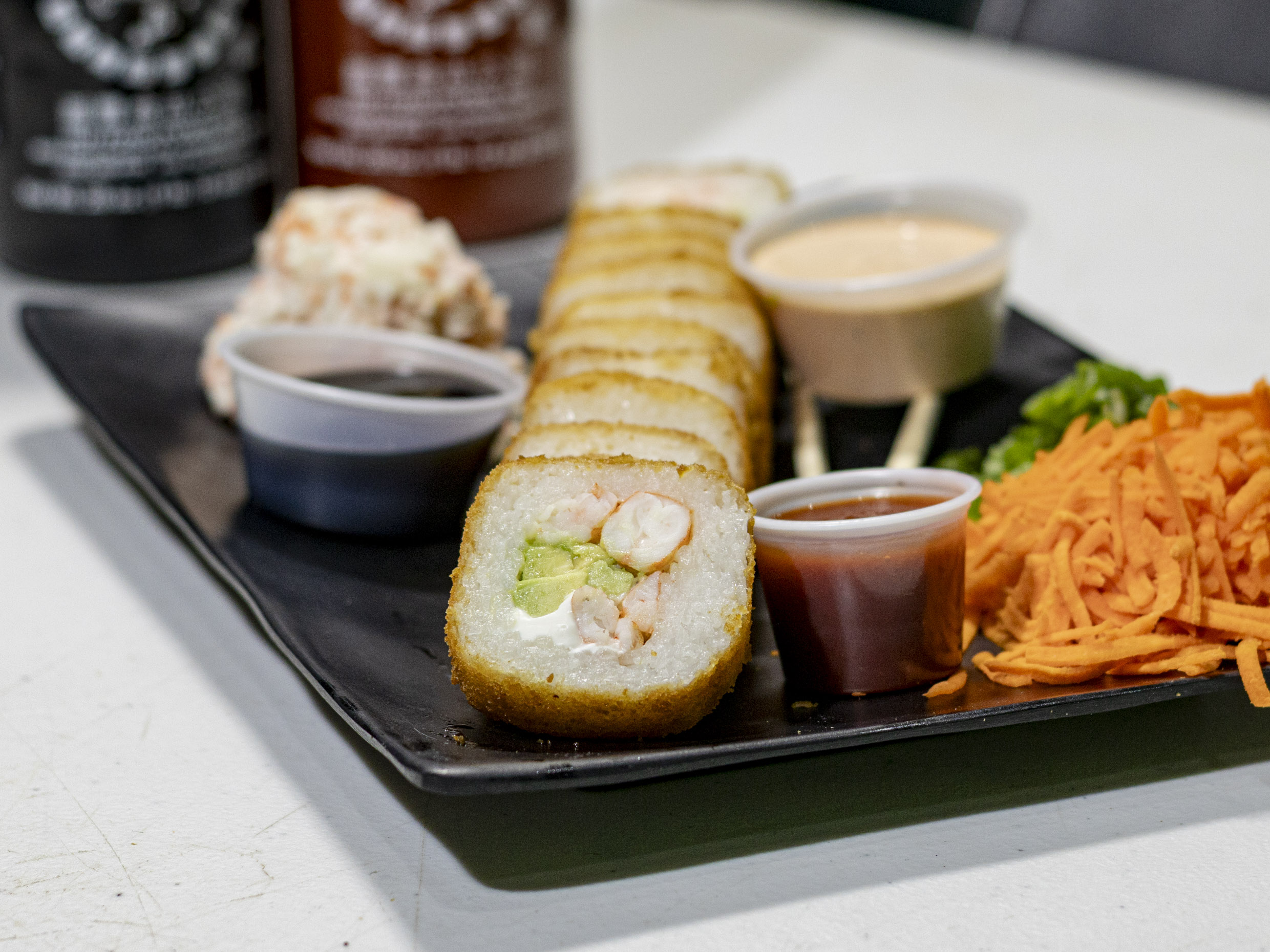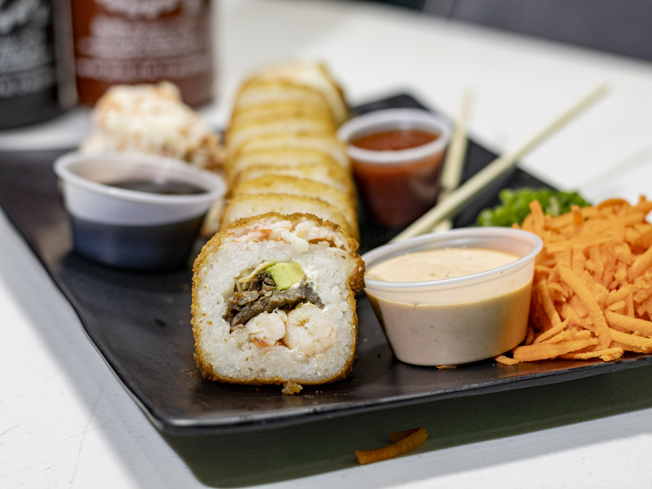 Philadelphia, aguacate, pollo, camarón adentro y cangrejo por fuera.
