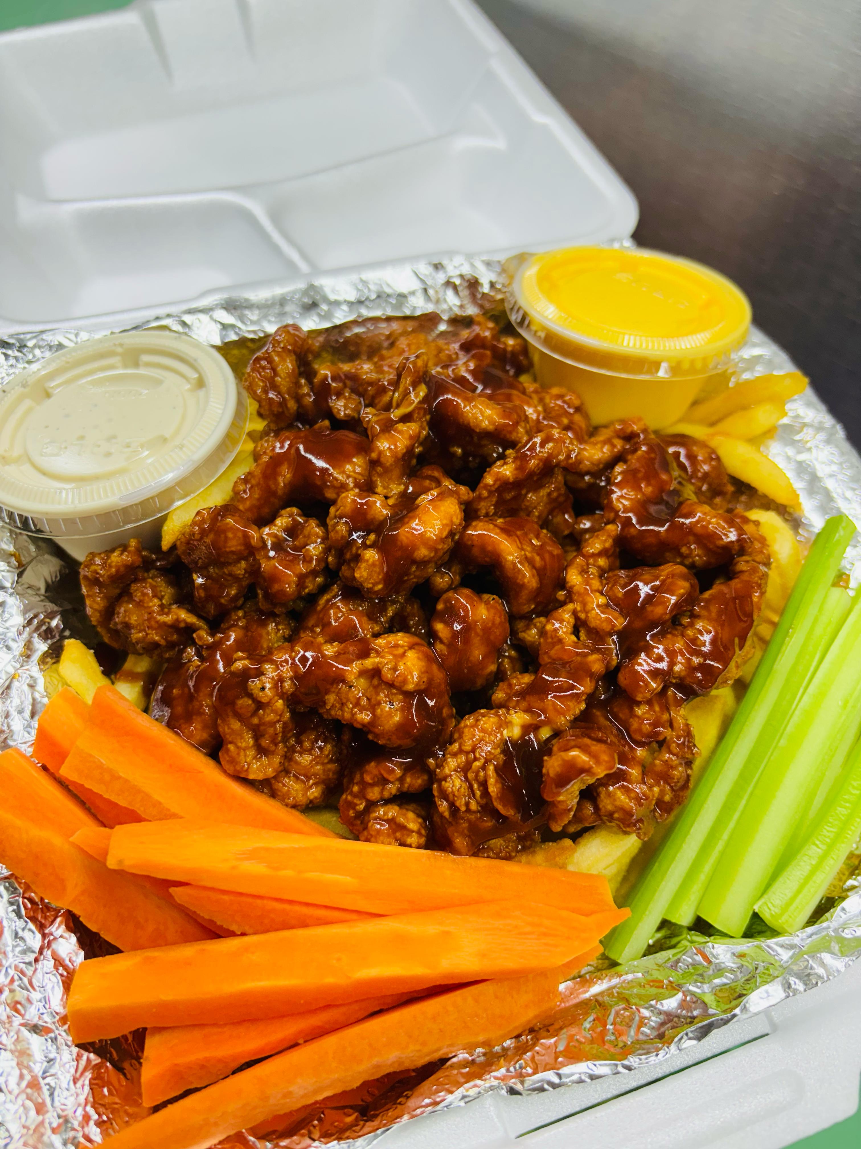 Boneless en la salsa de tu preferencia; con papas a la francesa. Lleva tiras de zanahoria, apio, aderezo ranch y queso amarillo.