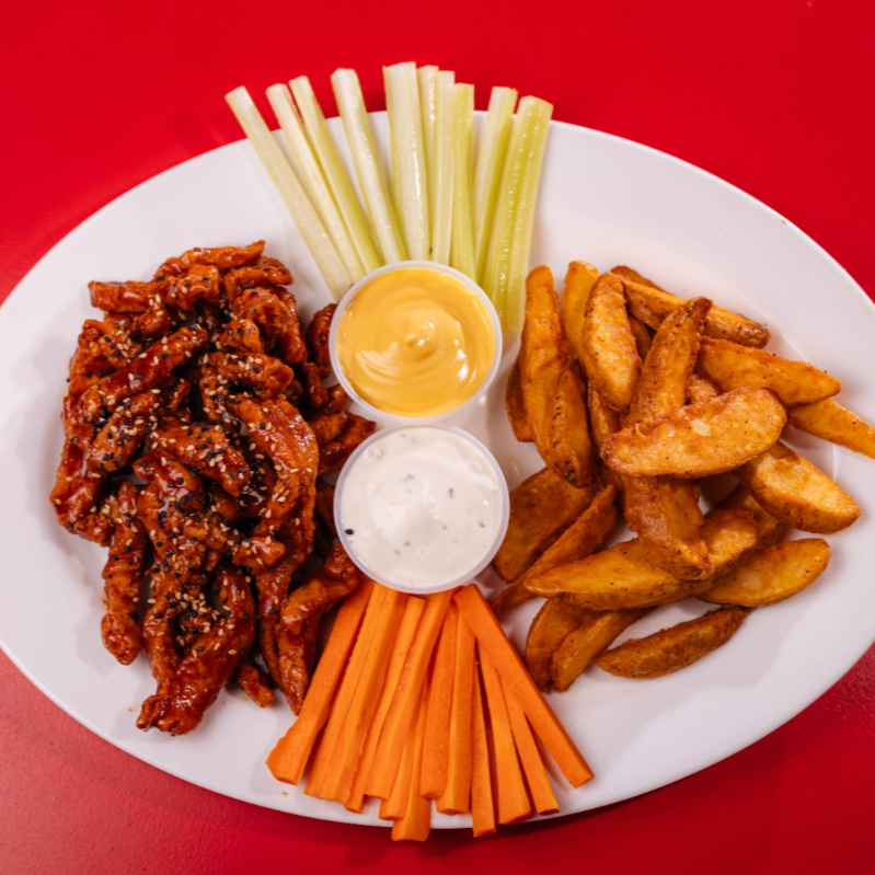 200 g De pollo en salsa a elegir (BBQ, búfalo, cookies, mango habanero) con papas gajo, aderezo ranch, zanahoria y apio.