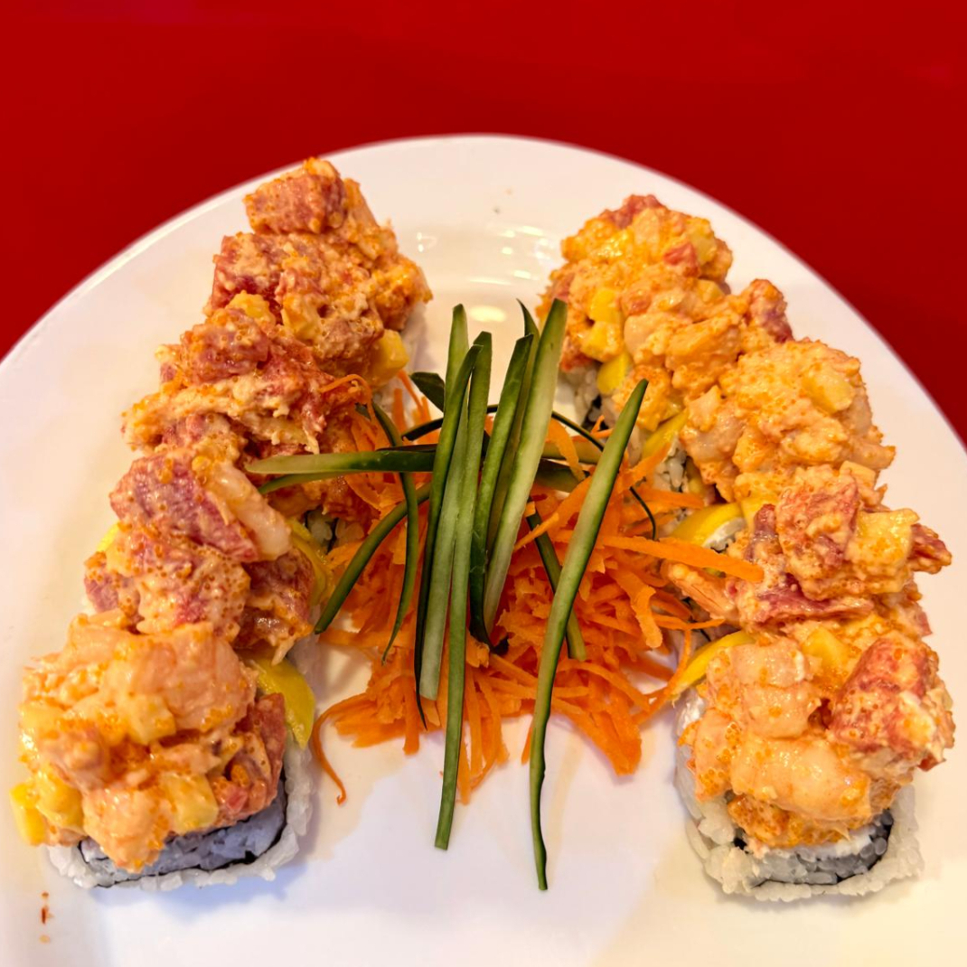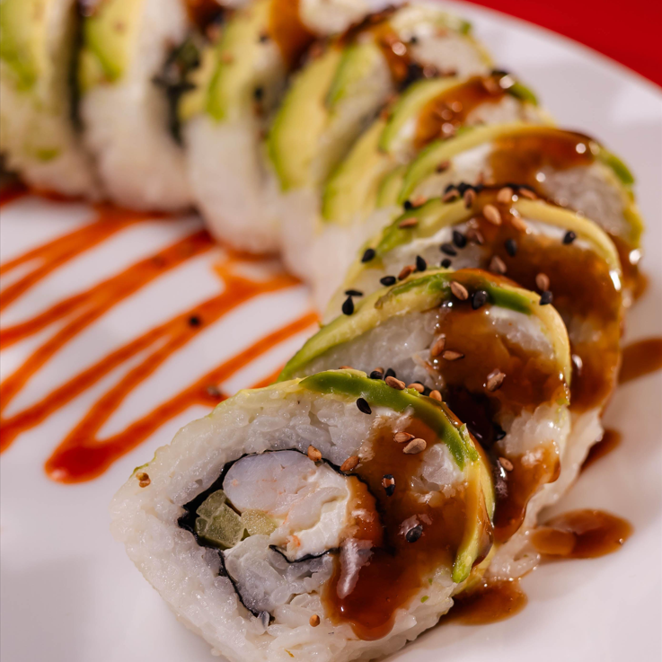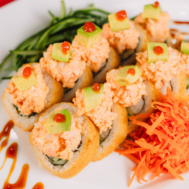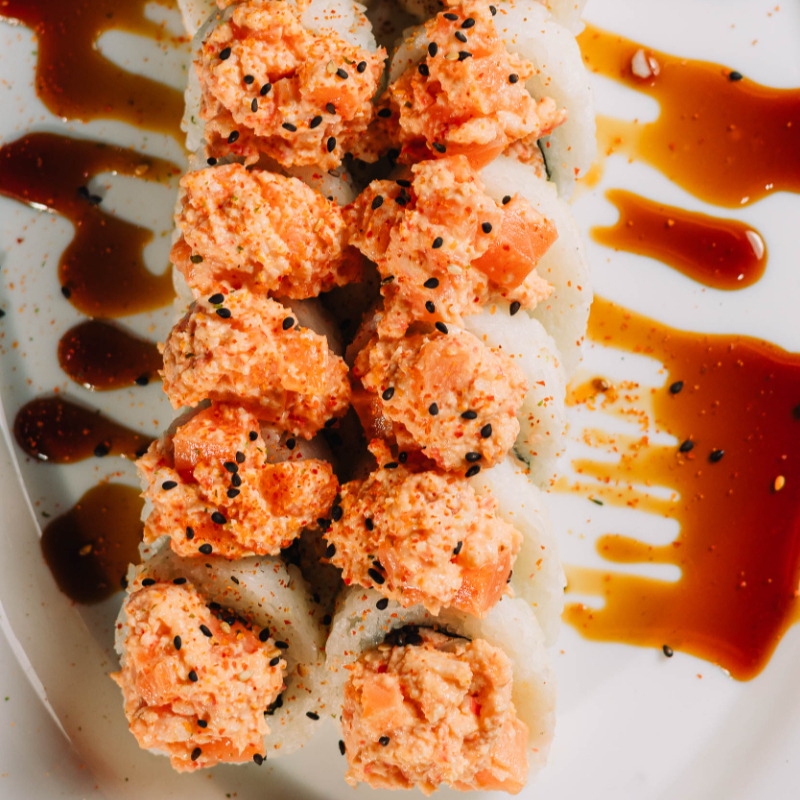 Dentro: Camarón, filadelfia y pepino. Fuera: salmón y filadelfia. Encima: aderezo especial de la casa con trozos de camarón, salsa de anguila y ajonjolí mixto.