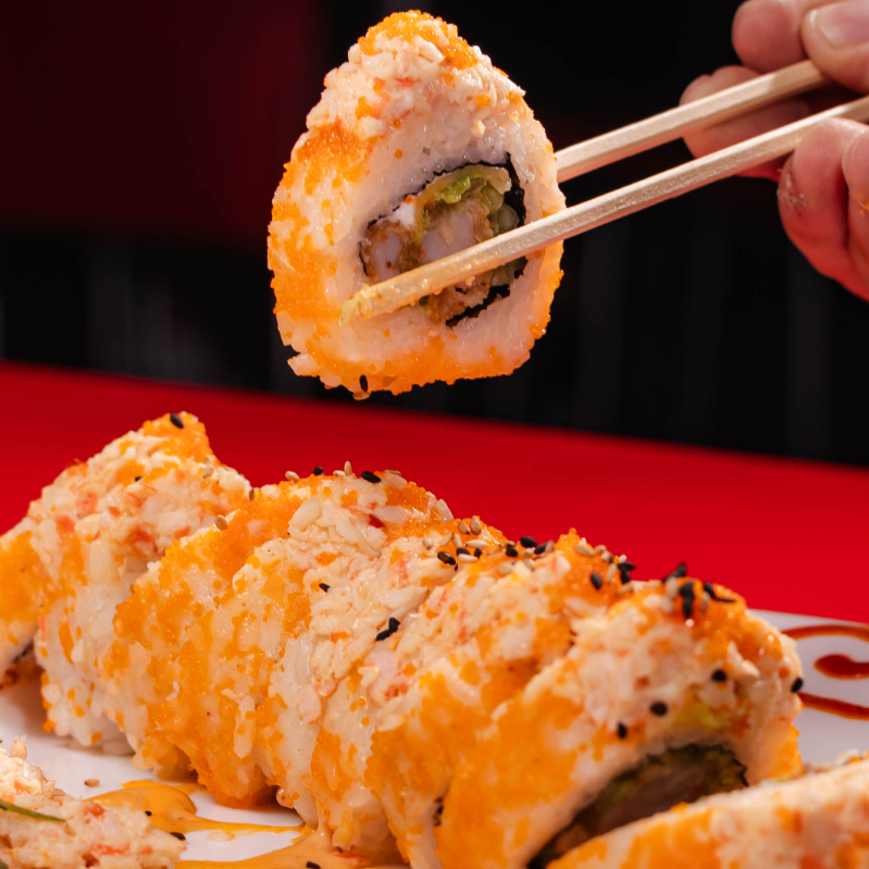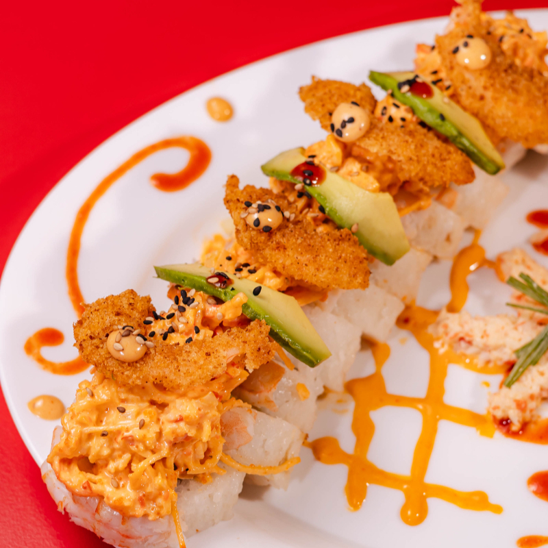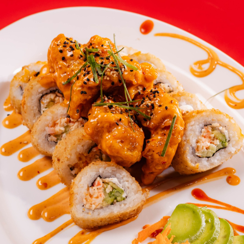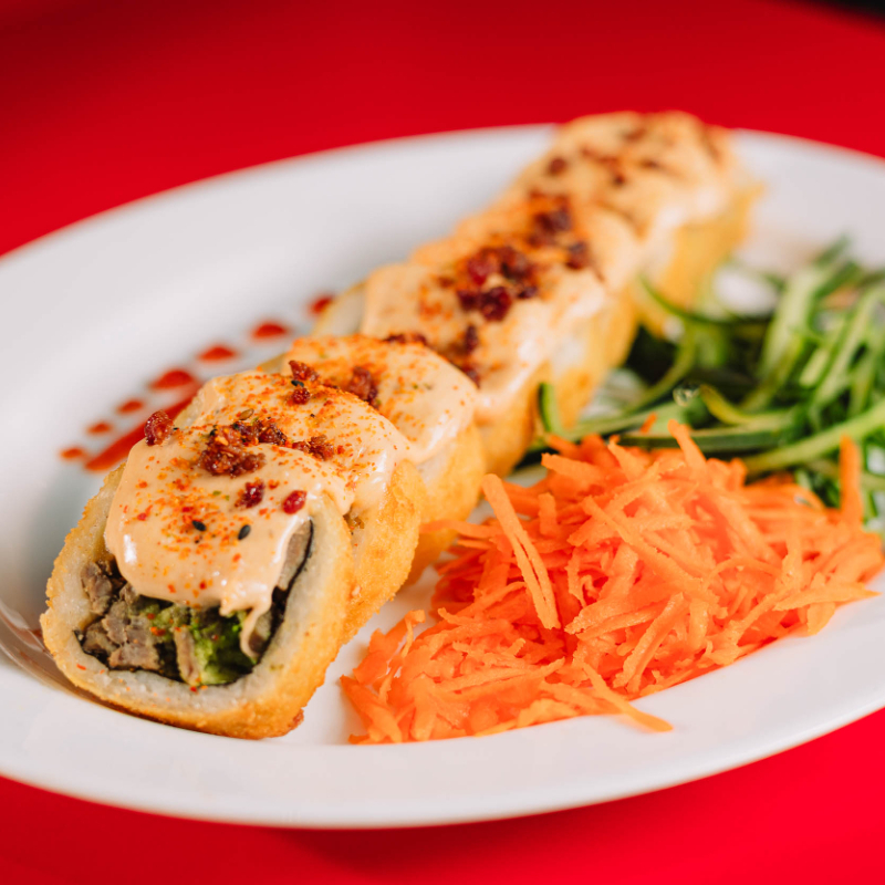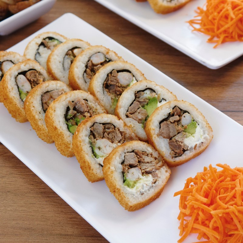 Dentro: carne, filadelfia, aguacate y pepino. Fuera: spicy hot, carne, queso manchego, chile güerito, tocino y aderezo chipotle