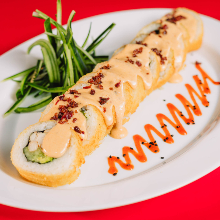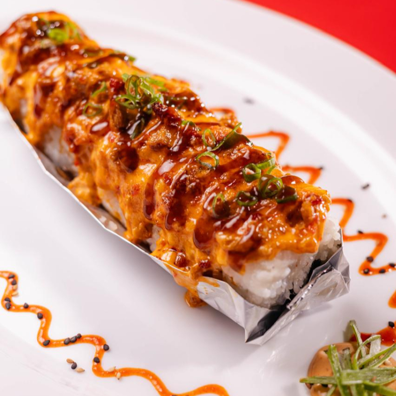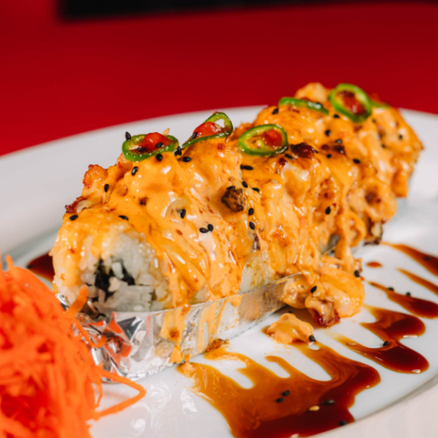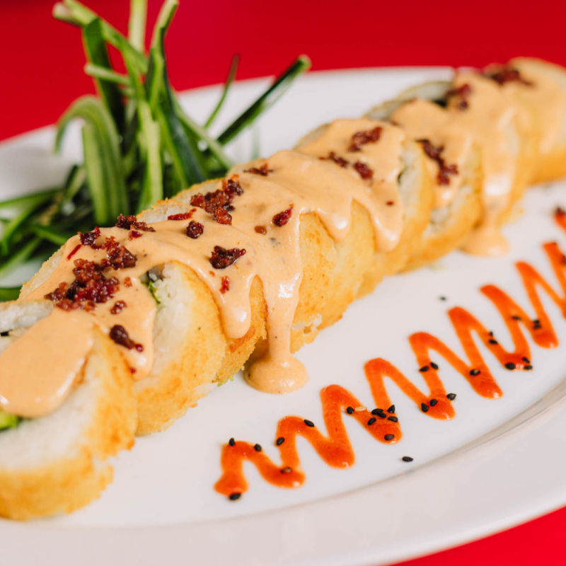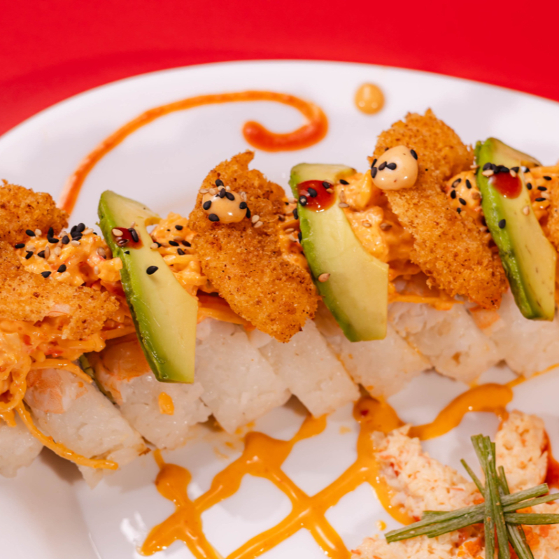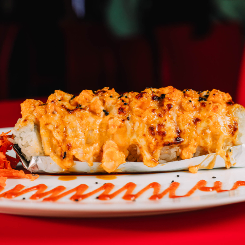 Dentro: carne, filadelfia, aguacate y pepino. Fuera: spicy hot, carne, queso manchego, chile güerito, tocino y aderezo chipotle