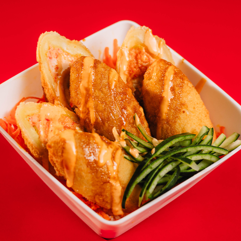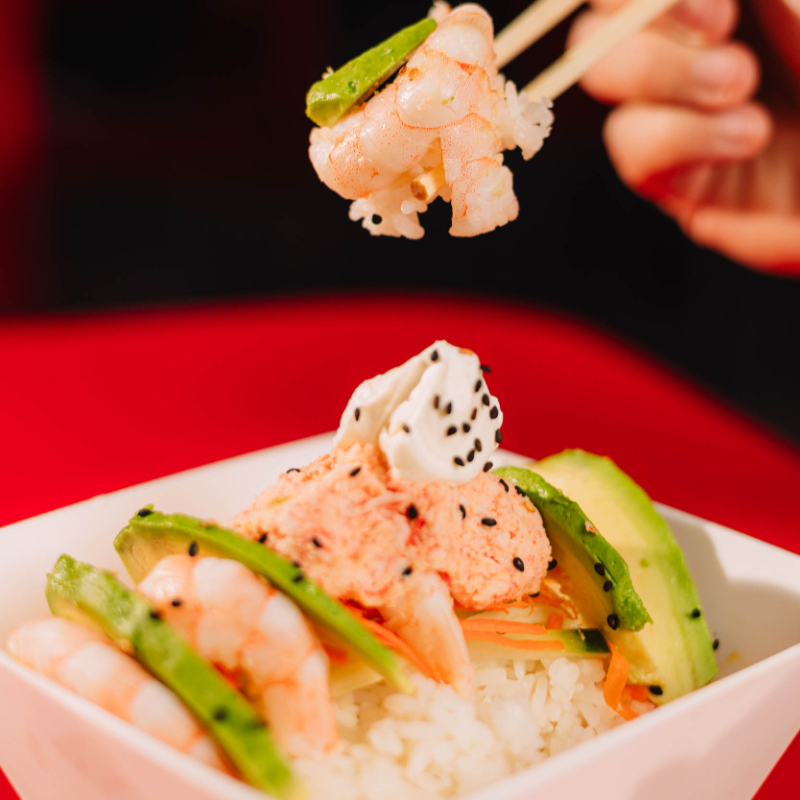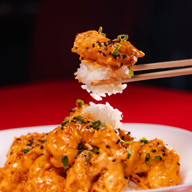 Camarones rocca sobre cama de arroz al vapor con zanahoria, bañados en aderezo spicy, salsa de anguila y togarashi.