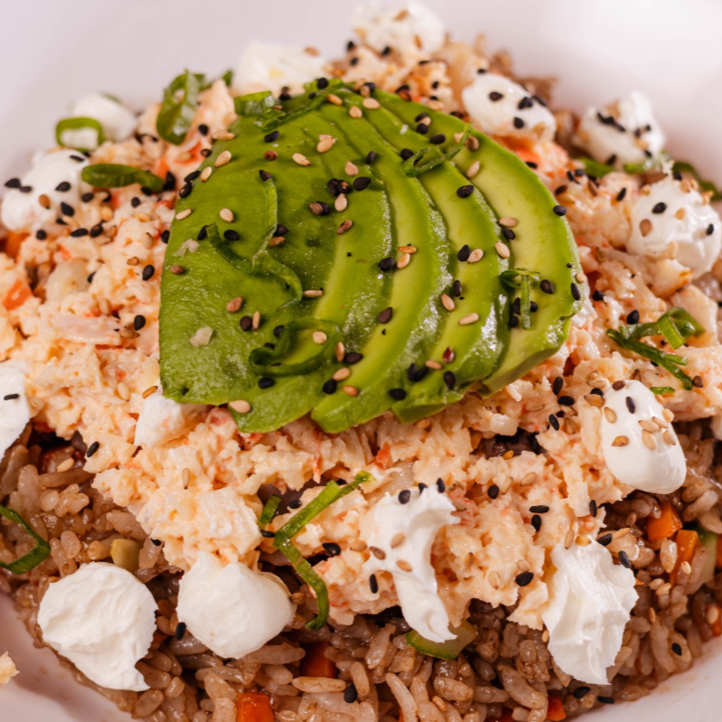 Arroz frito con calabaza y zanahoria (camarón, res o pollo) con Philadelphia, tampico, aguacate y ajonjolí.