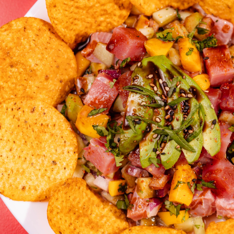 Medallón de atún, mango, aguacate, chiltepín, pepino, cebolla morada, cilantro, salsa negra, aderezo spicy y ajonjolí.
