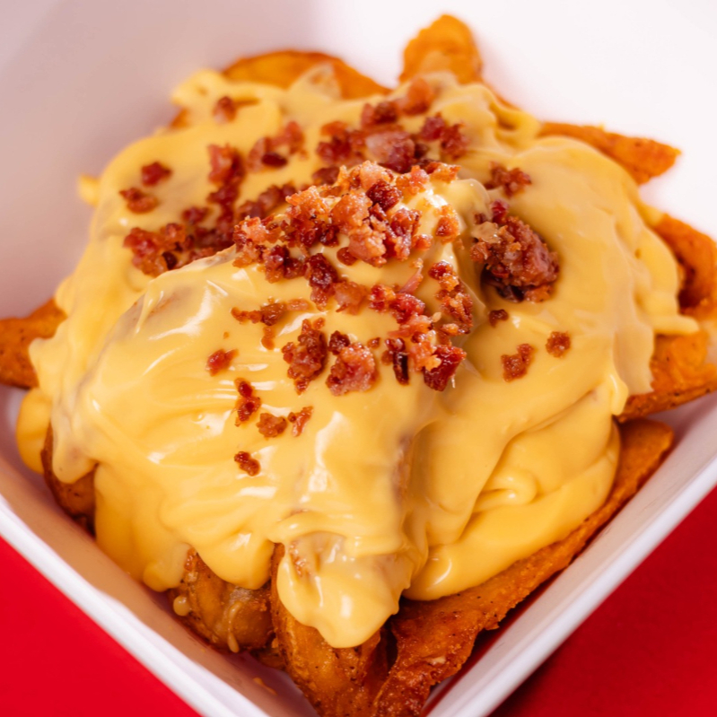 300 g De papas gajo bañadas en queso cheddar y tocino frito.