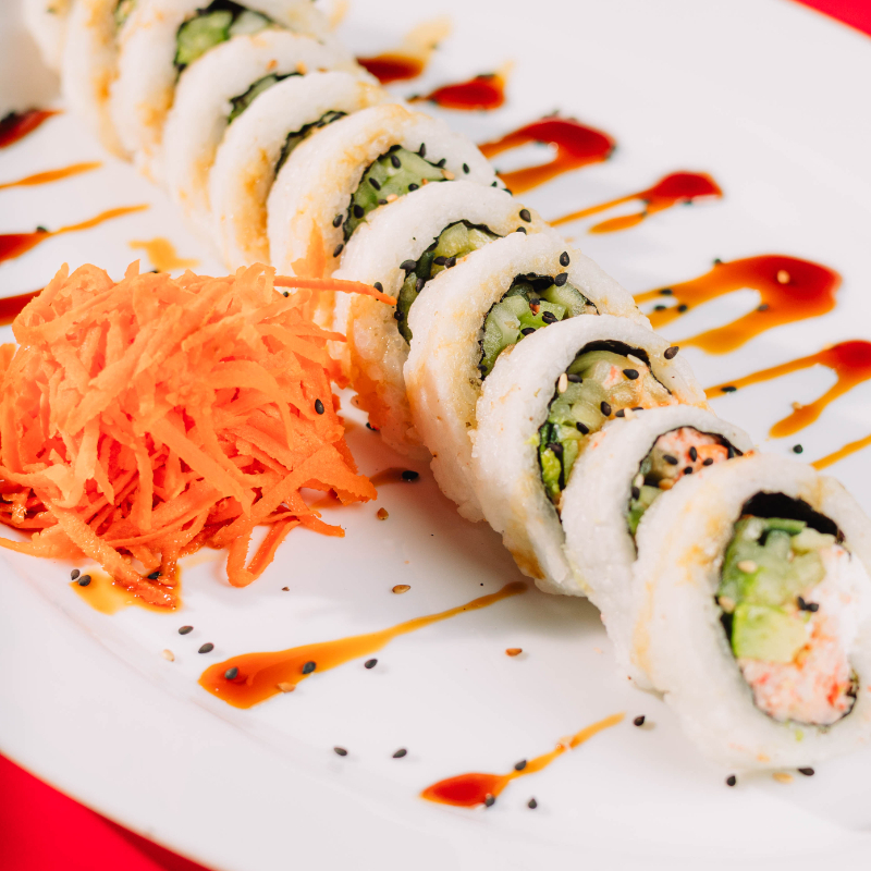 Dentro: surimi, pepino y Philadelphia. Fuera: Philadelphia, ajonjolí y salsa de anguila.