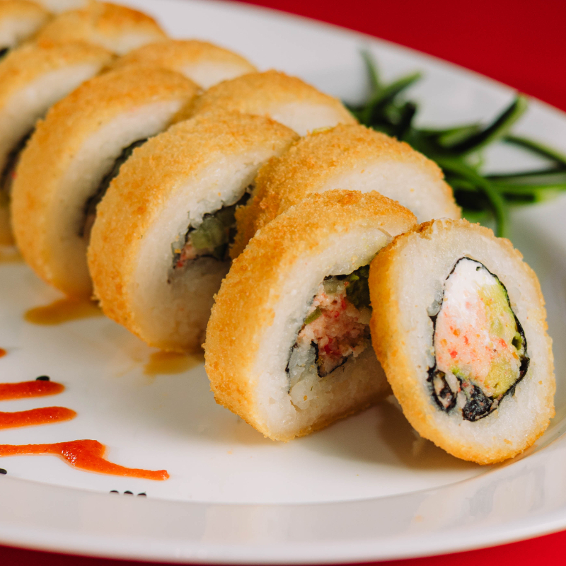 Camarón empanizado, pepino, aguacate y Philadelphia. Fuera: masago, tampico y ajonjolí.