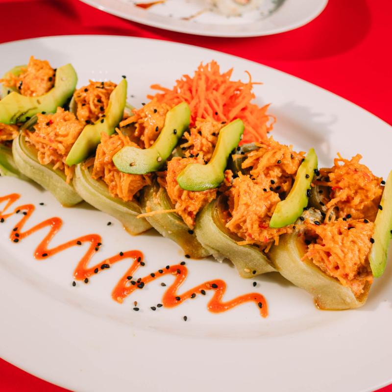 Tampico, pepino y Philadelphia. Fuera: salmón, ensalada de cangrejo, aderezo spicy, salsa de anguila, aguacate y sriracha.