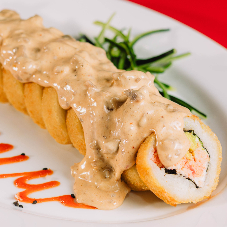 Tampico, pepino, aguacate y Philadelphia. Fuera: topping de carne con queso Chihuahua gratinado y aderezo chipotle.