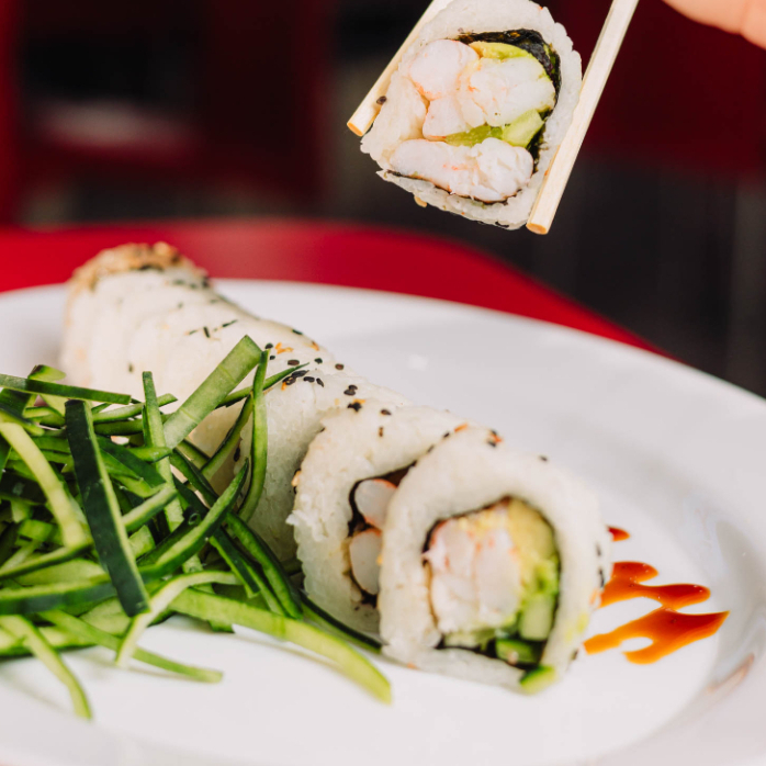 Camarón, res, pepino, Philadelphia y aguacate.