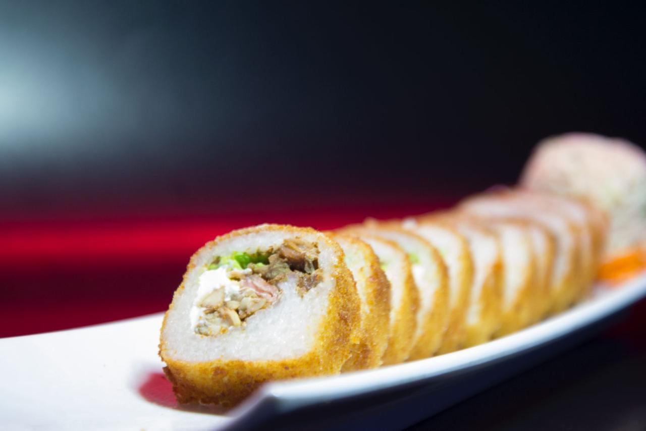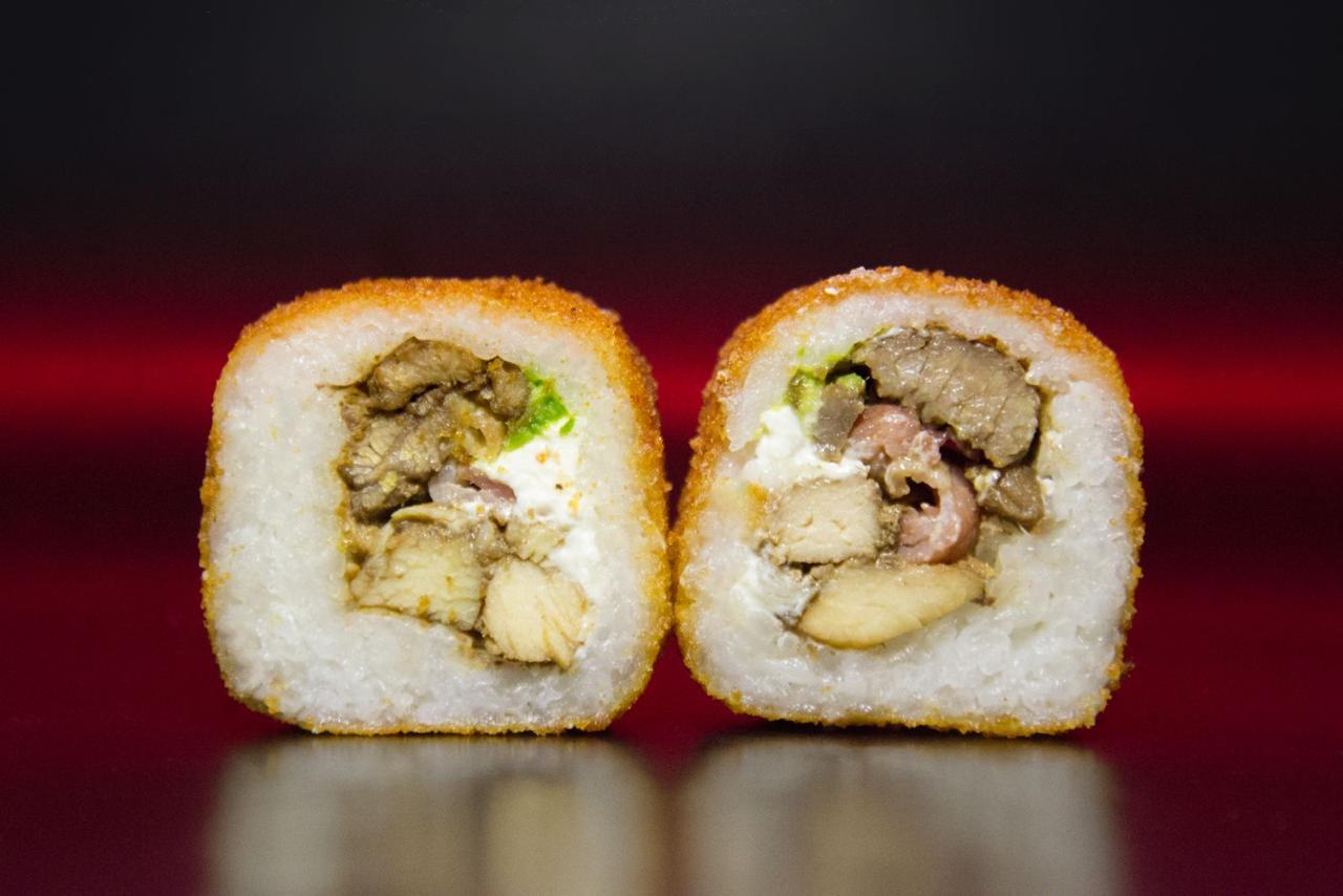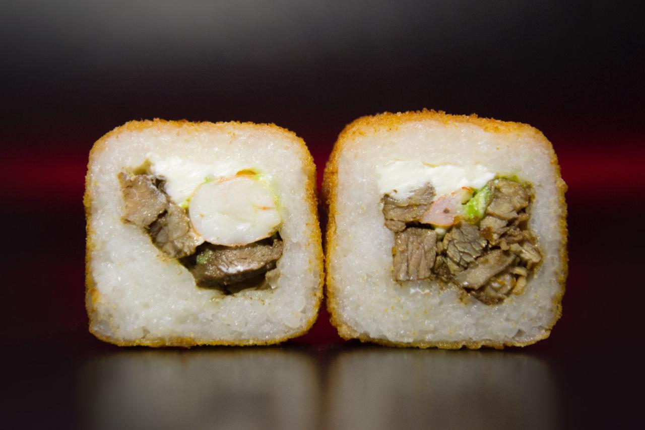 Pollo, res, camarón, queso crema, aguacate y pepino. Incluye tampico.