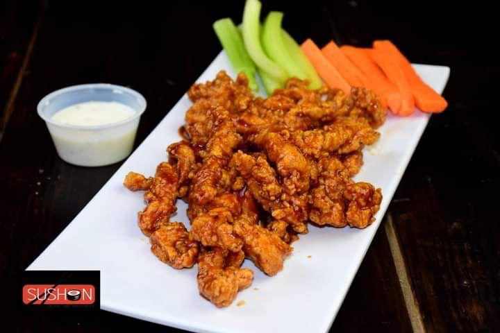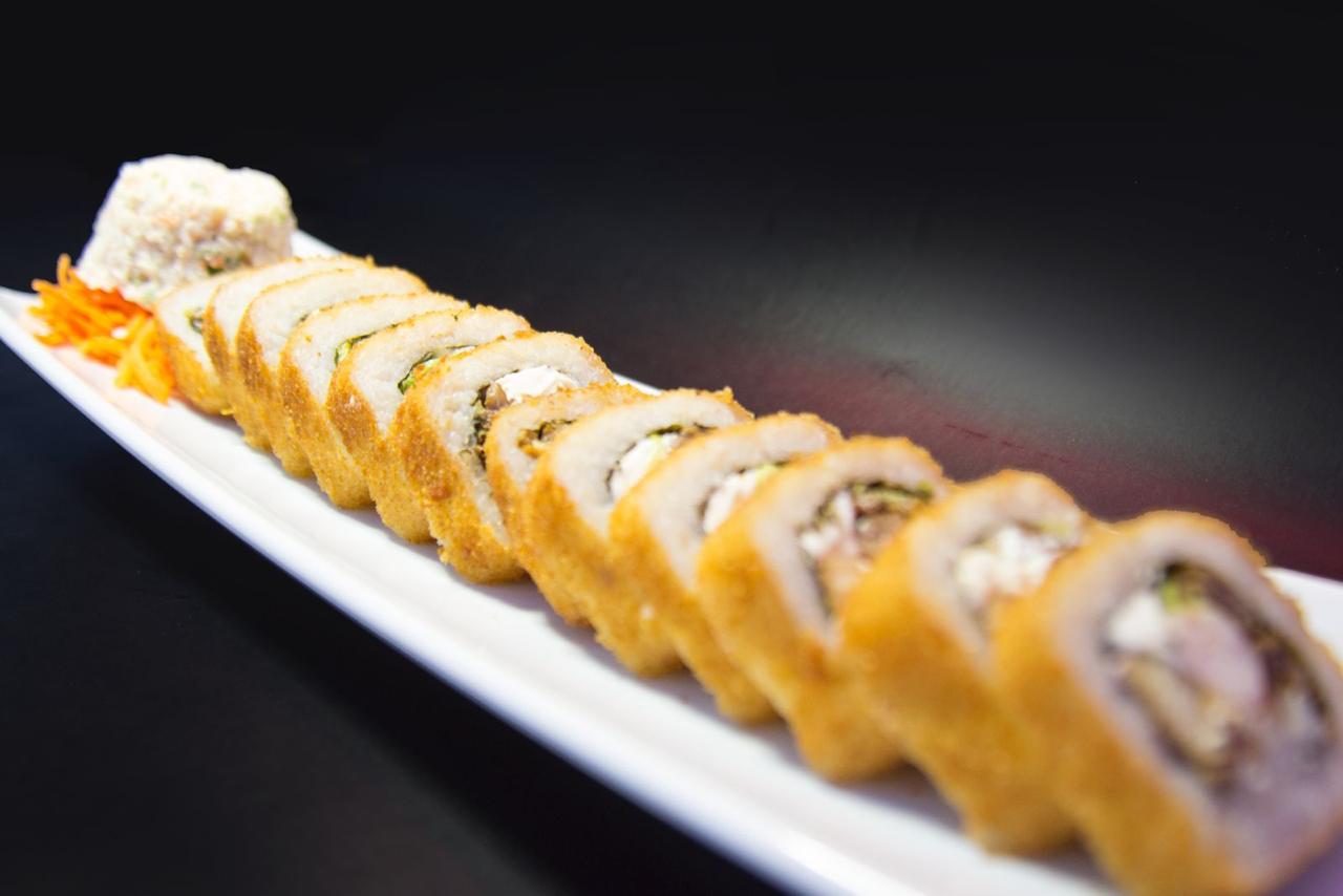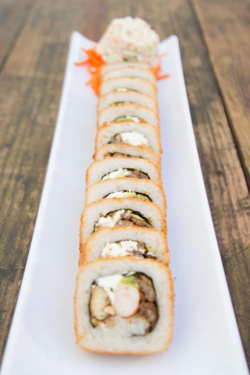 12 bocados .Pollo, res, tocino, queso crema, aguacate y pepino. Incluye tampico.