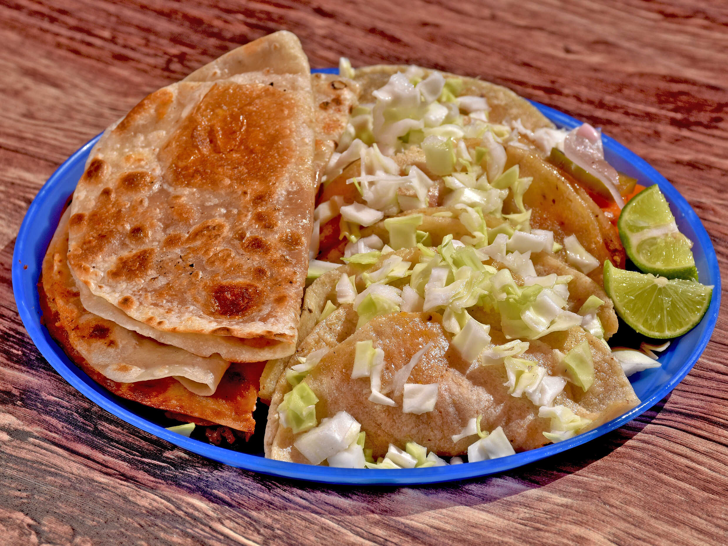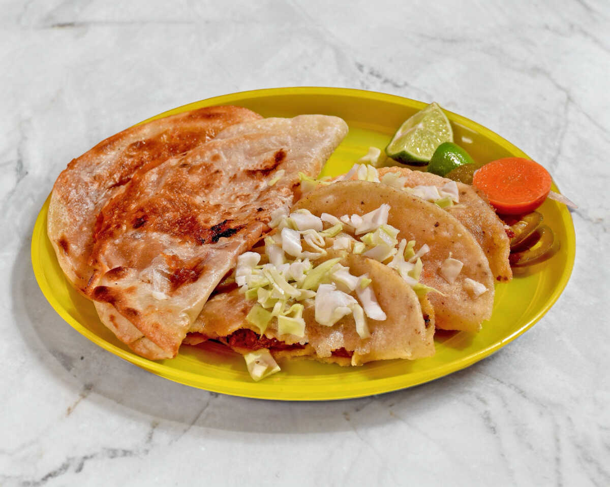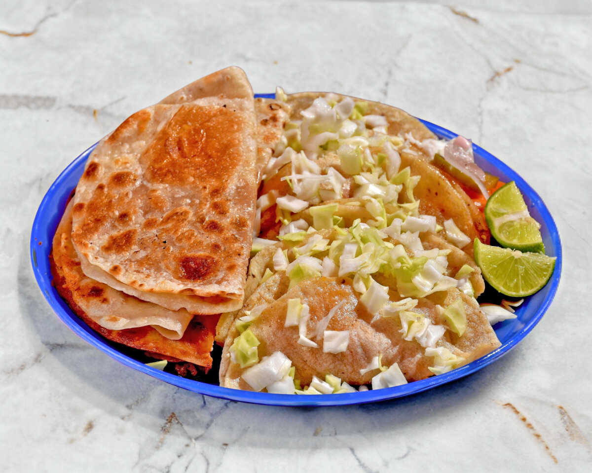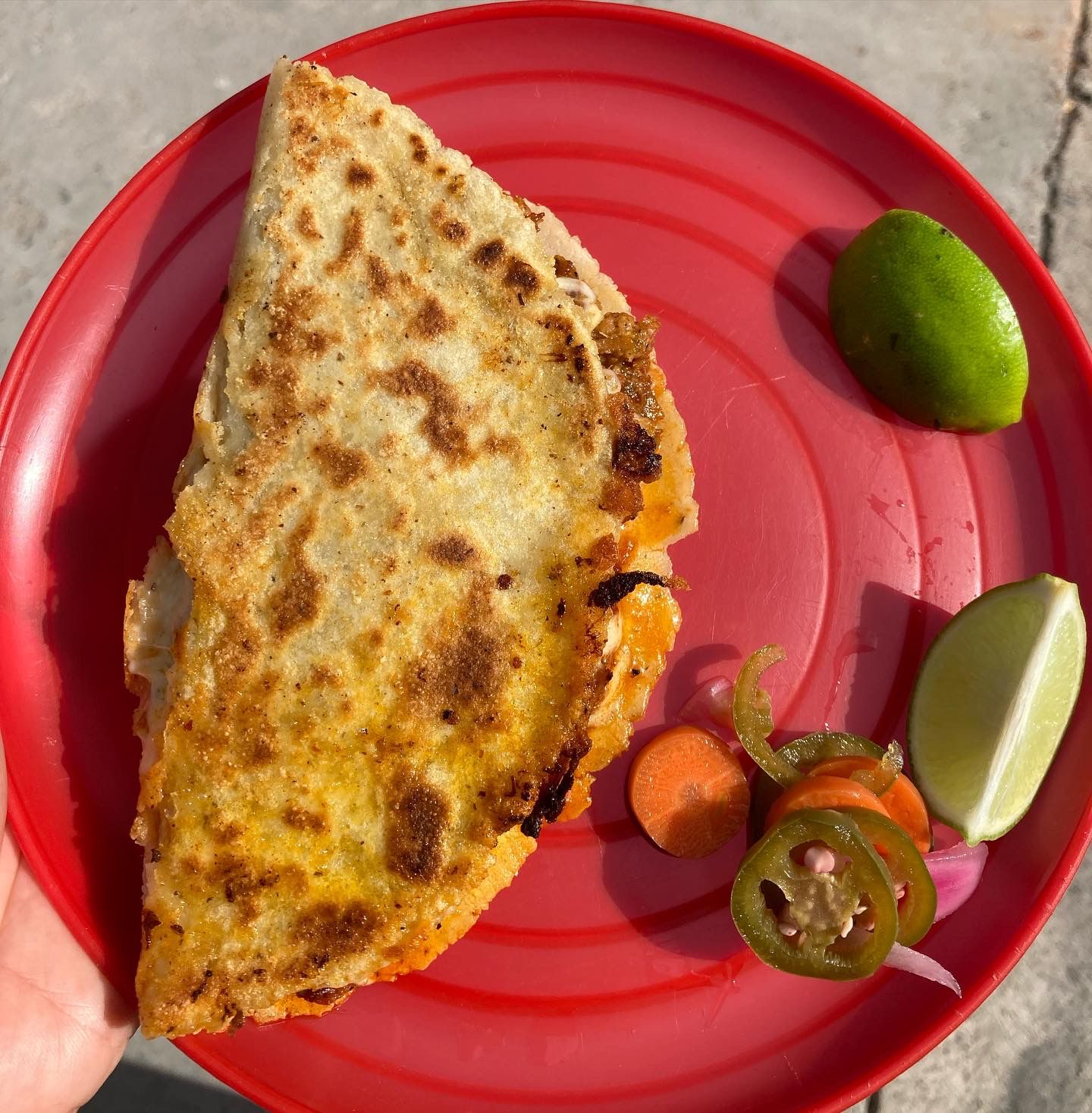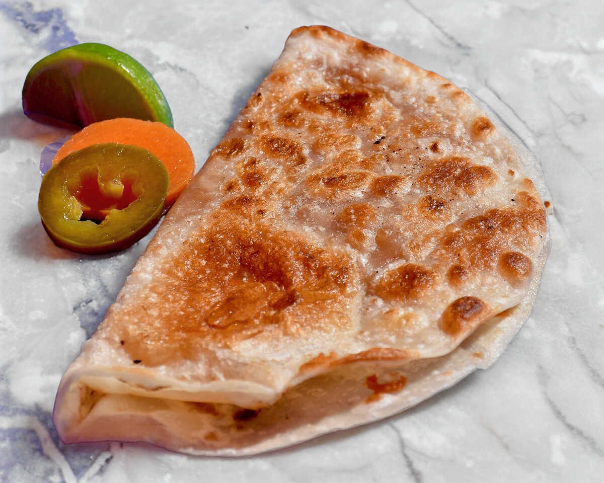 Quesadilla doble de tortilla de harina gordita con chilorio y chicharrón prensado