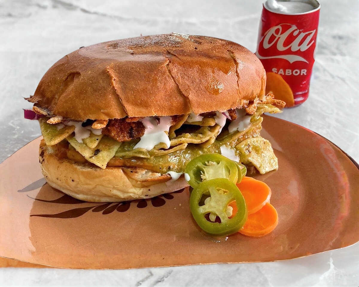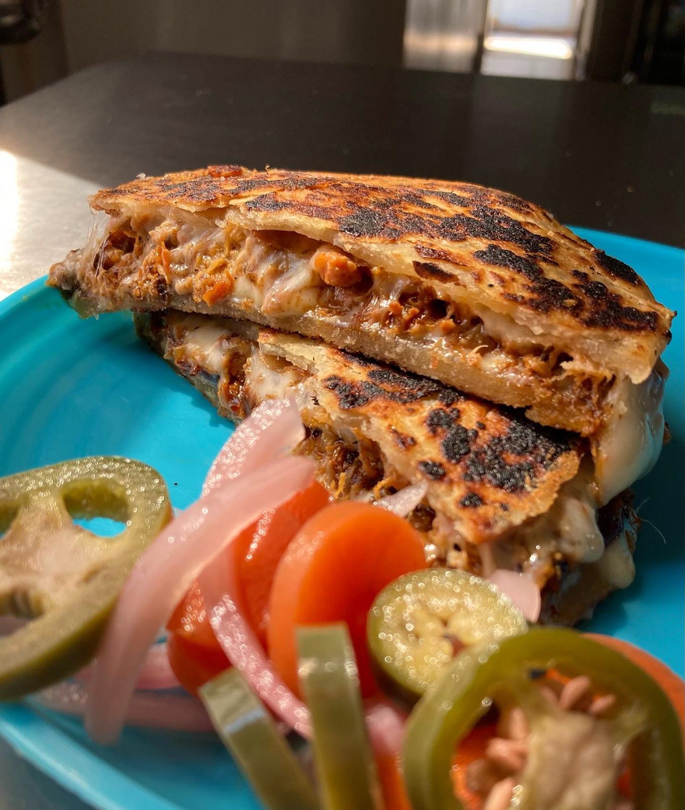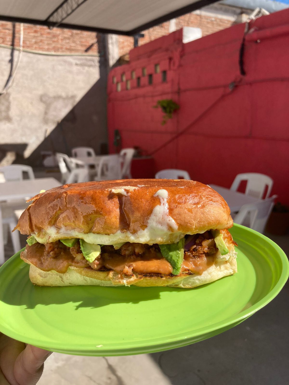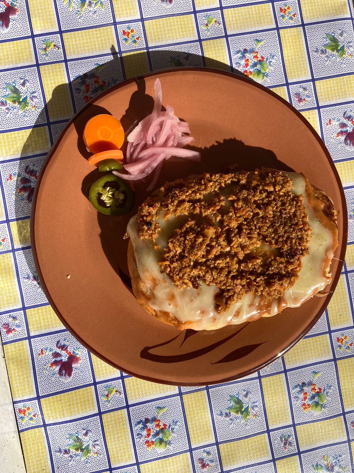 Torta de chilorio con frijoles, costra de queso, cebolla morada y aguacate