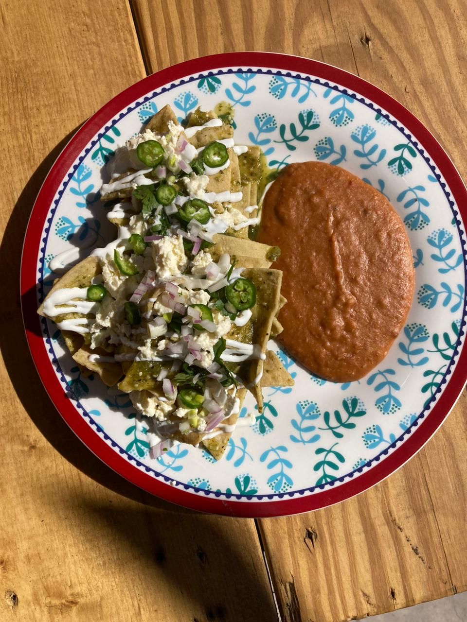 Orden de chilaquiles el guiso de tu elección, acompañado de frijoles, crema, cebolla morada, cilantro y queso fresco.