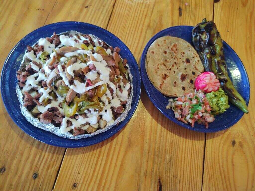Cama de papa con mantequilla, queso, champiñones, chile verde, media crema, carne asada y carne al pastor, acompañada de tortilla de su preferencia