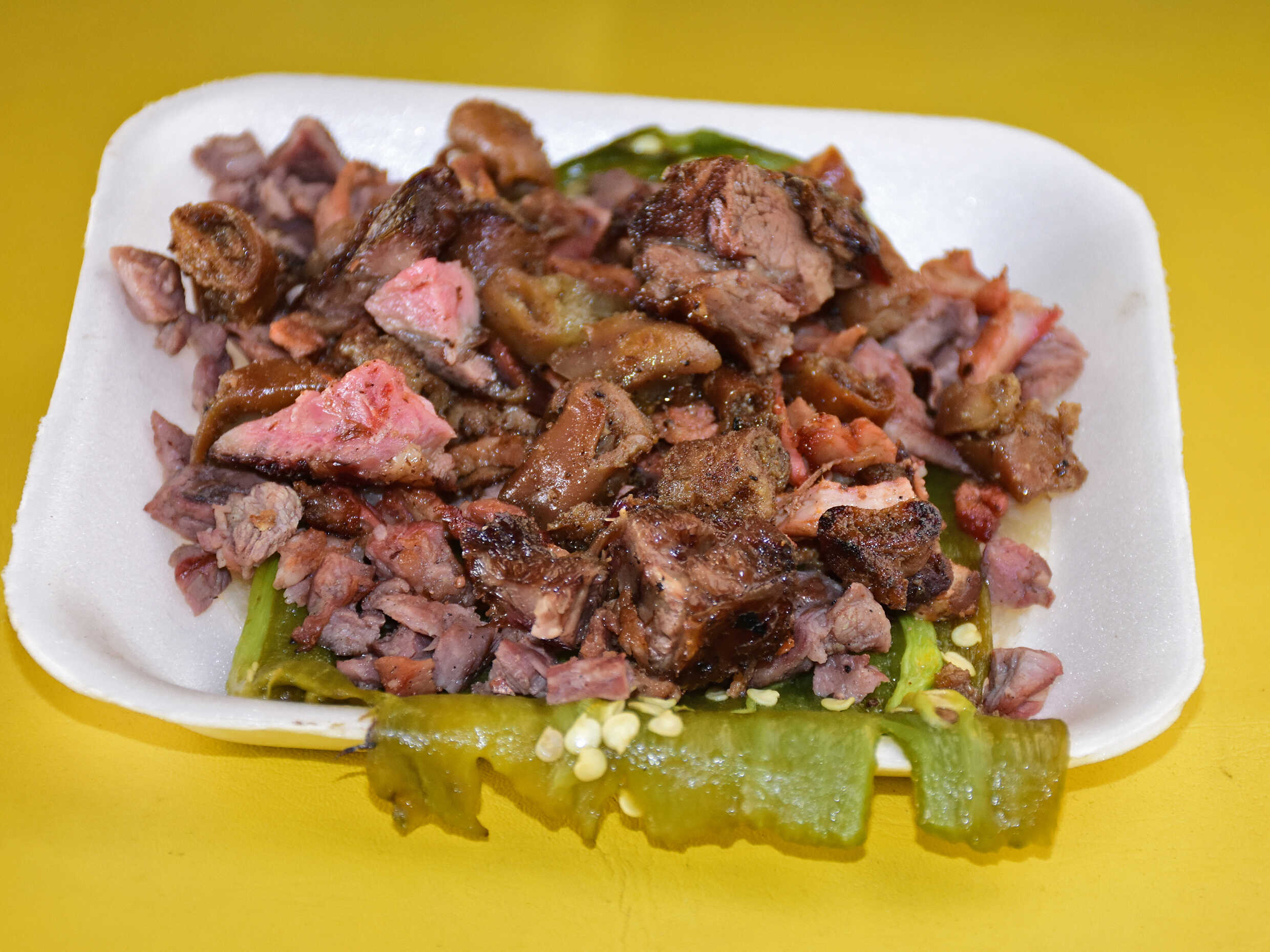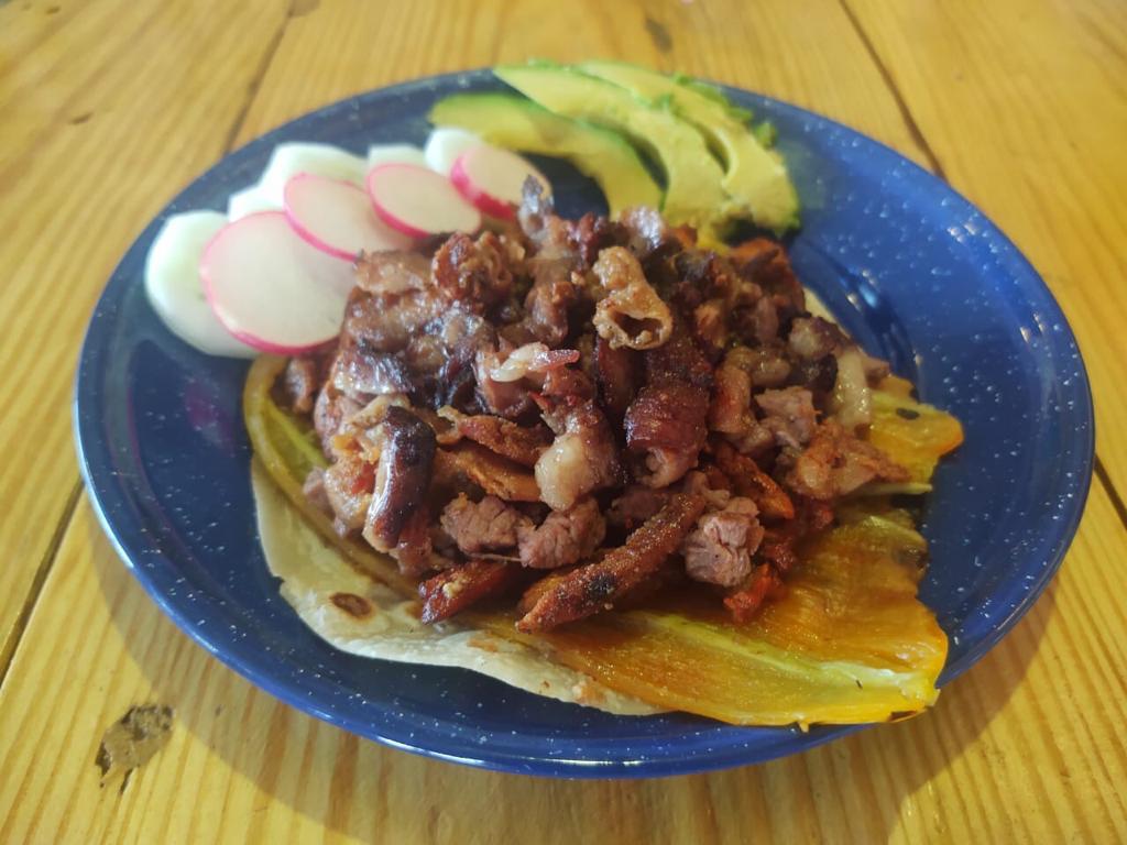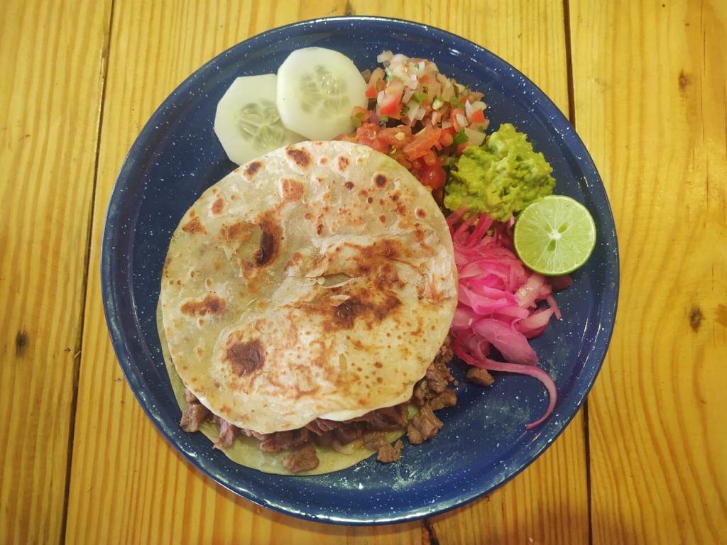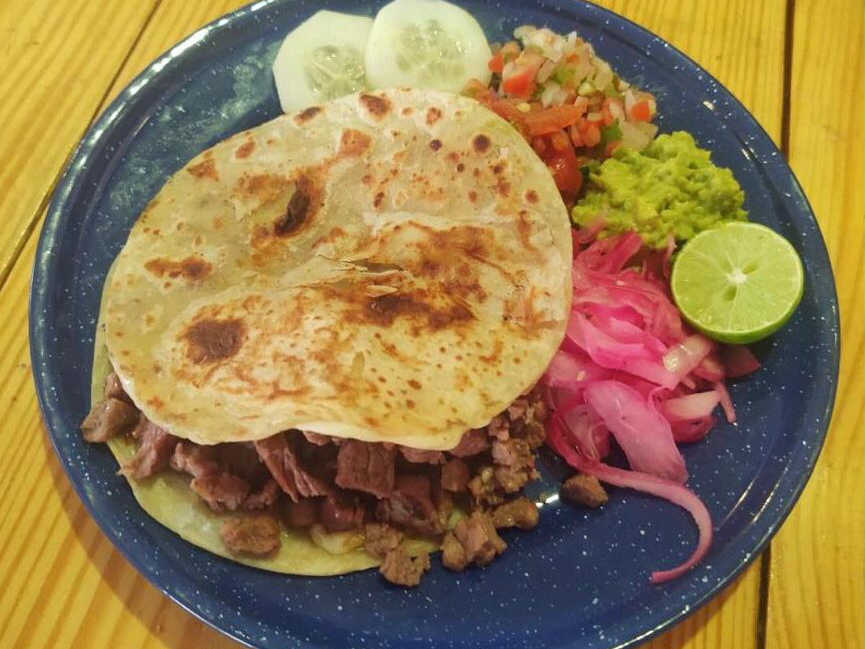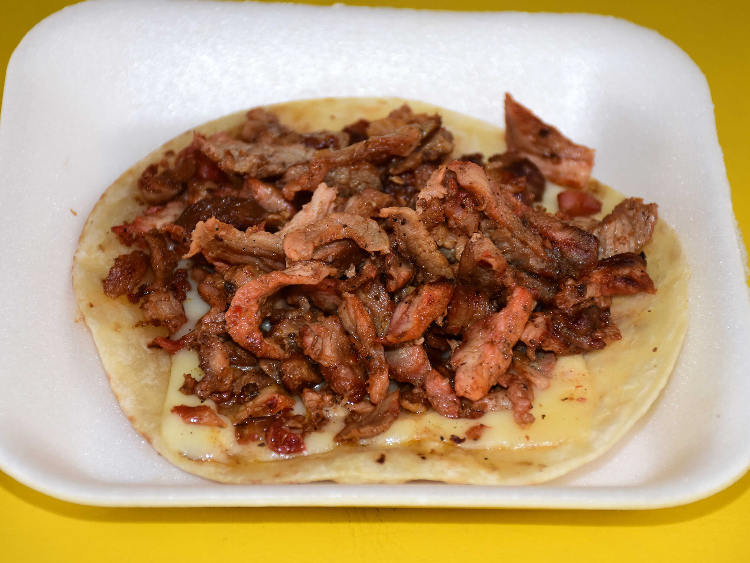 Doble tortilla de harina o maíz con queso, carne asada, carne al pastor, tripa y rasurado