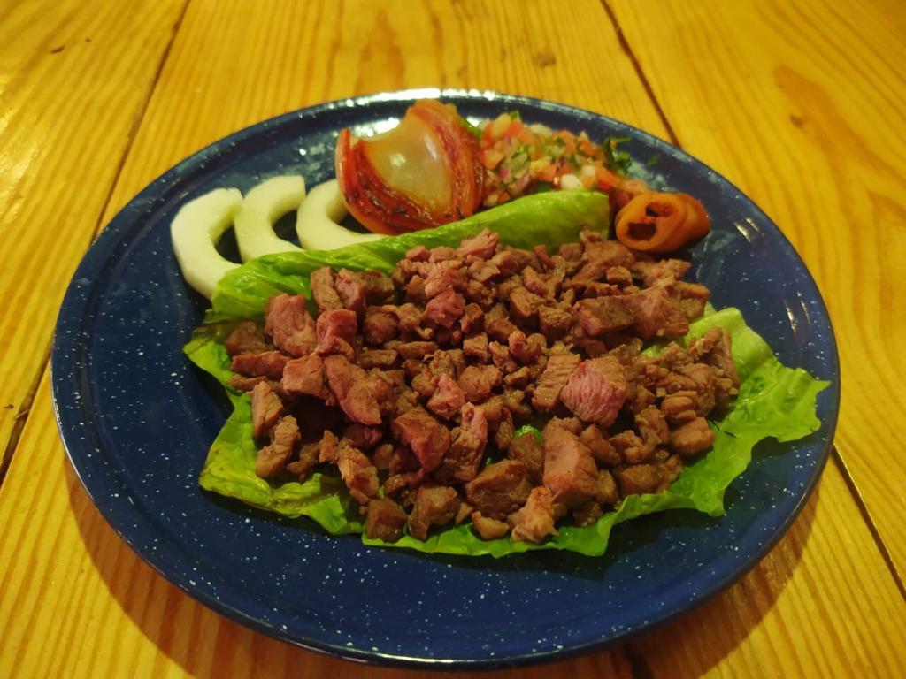 Cama de papa con mantequilla, queso, champiñones, chile verde, media crema y carne asada acompañada de tortilla de su preferencia