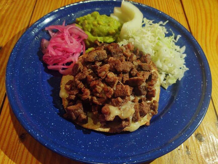 Tostada de maíz con frijol queso, carne asada y carne al pastor