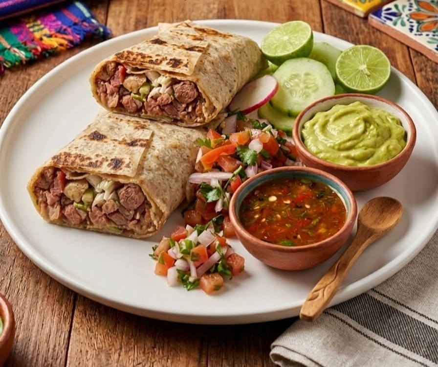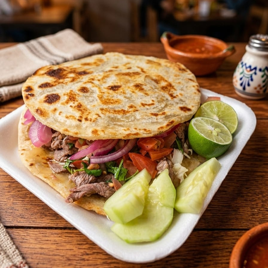 Hecha con doble tortilla de harina y carne asada. Acompañada de salsa bandera, salsa tatemada, salsa roja, repollo, frijol, pepino, rabanitos, limones, aguacate, cebollita asada, chile verde tatemado.