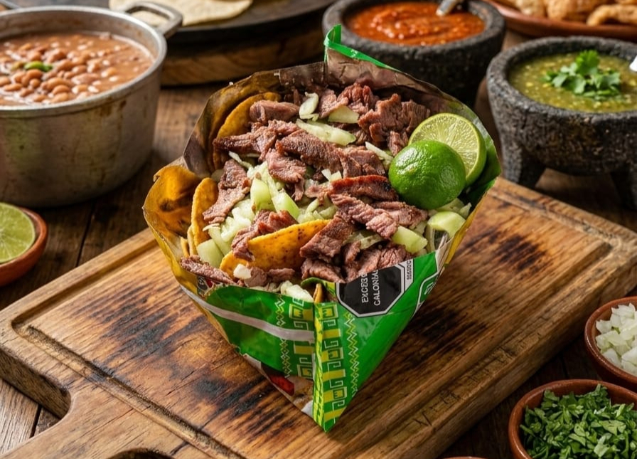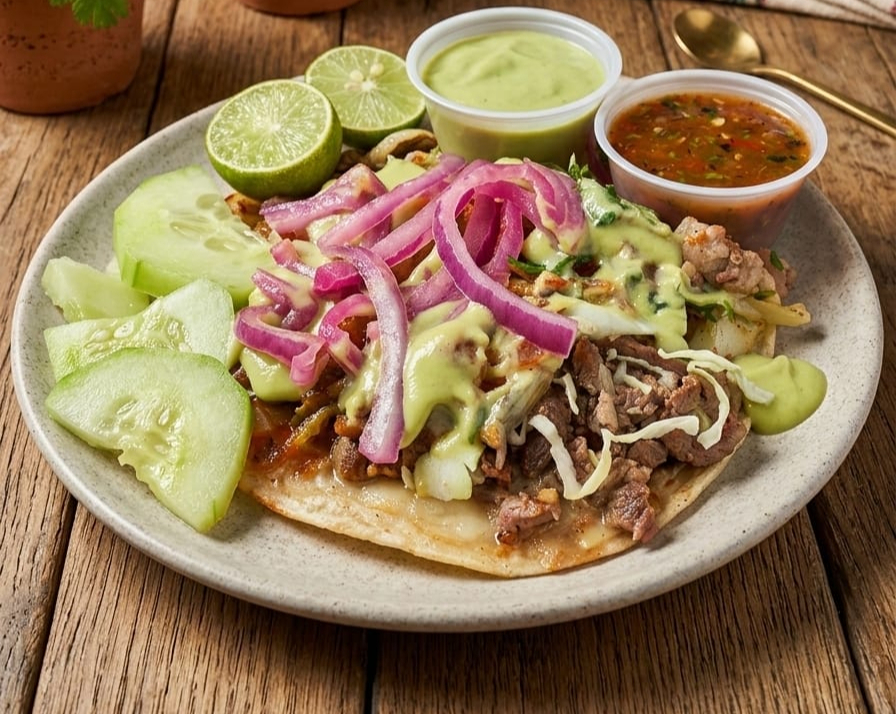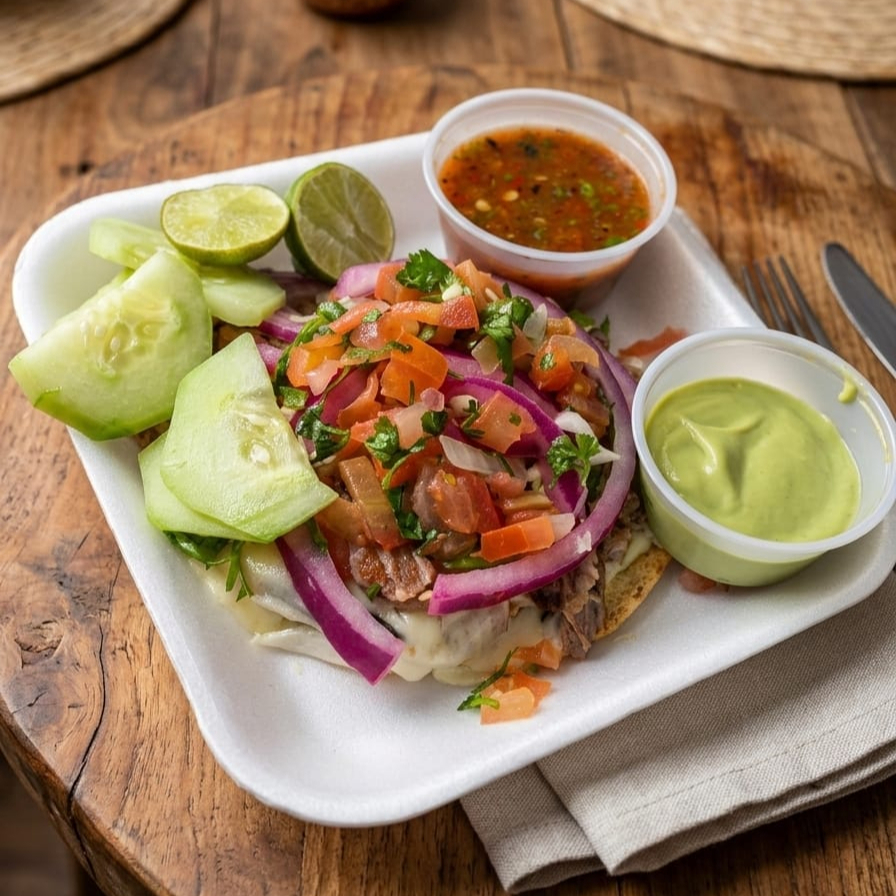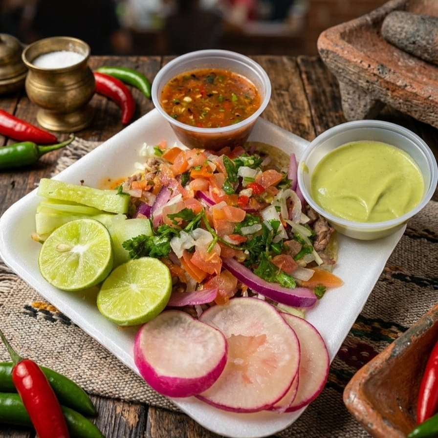 Hecho con tortilla sobaquera, carne asada, repollo, frijol. Acompañado de salsa bandera, salsa tatemada, salsa roja, pepino, rabanitos, cebolla morada curtida, aguacate, limones, cebollita asada, chile verde tatemado.