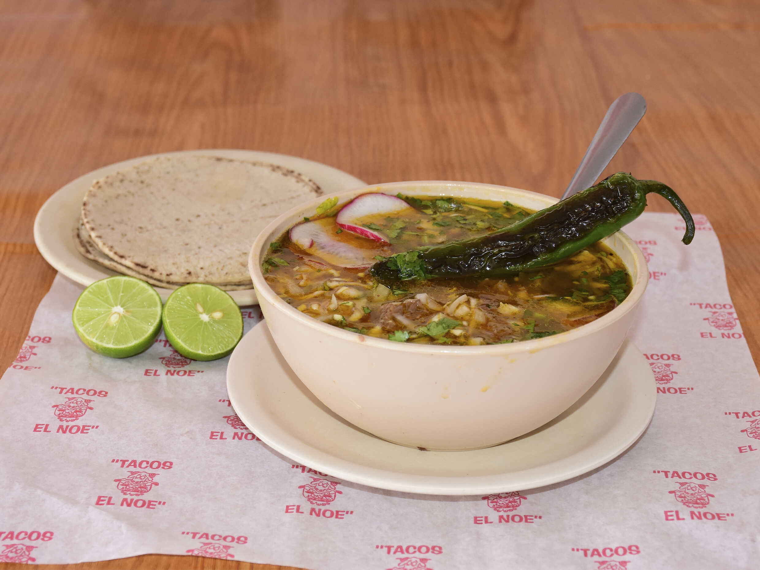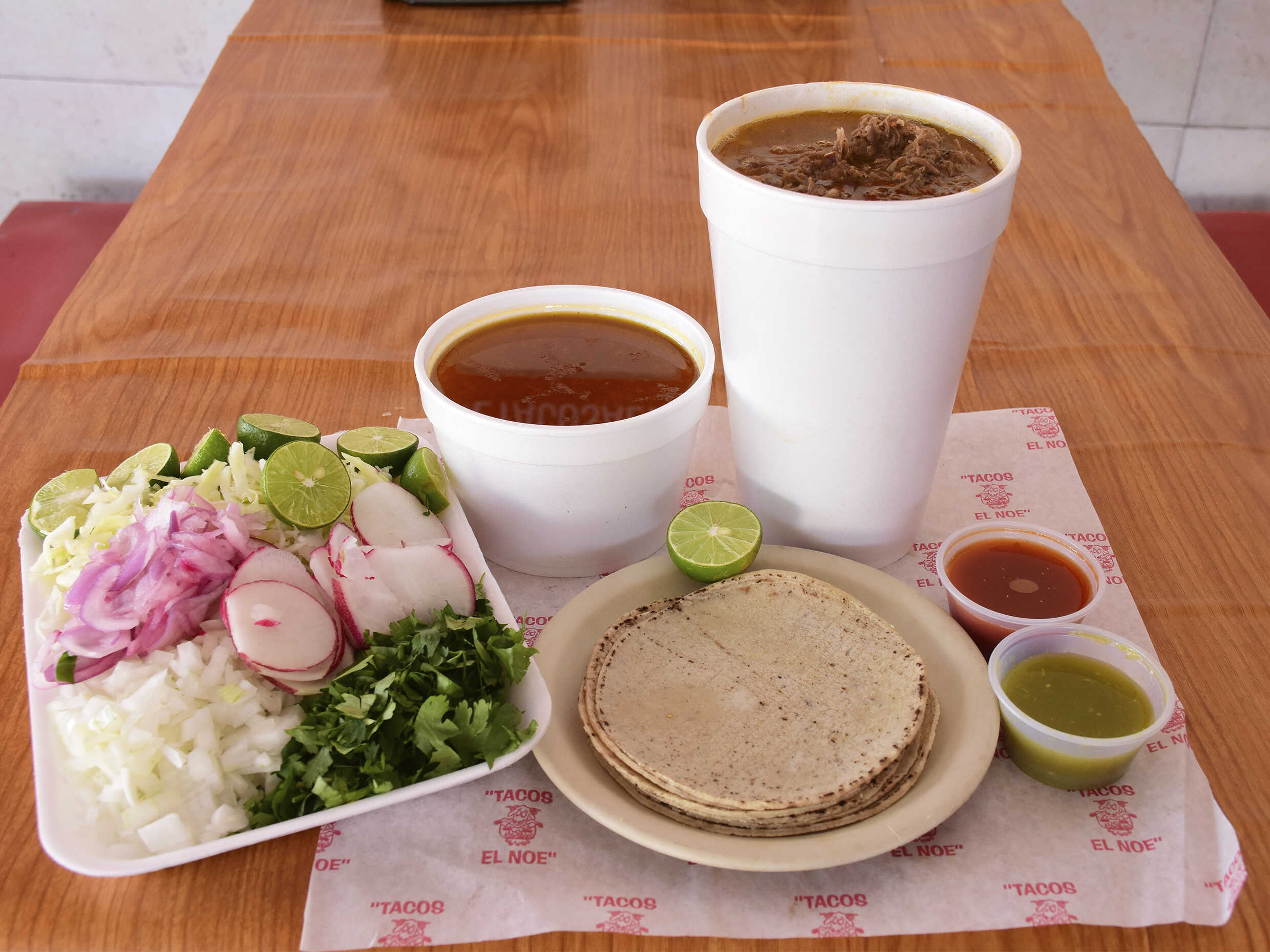 Jugo bichi, cabeza, borrego y acompañada de verdura, salsa y limones.